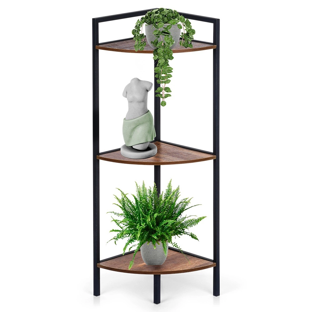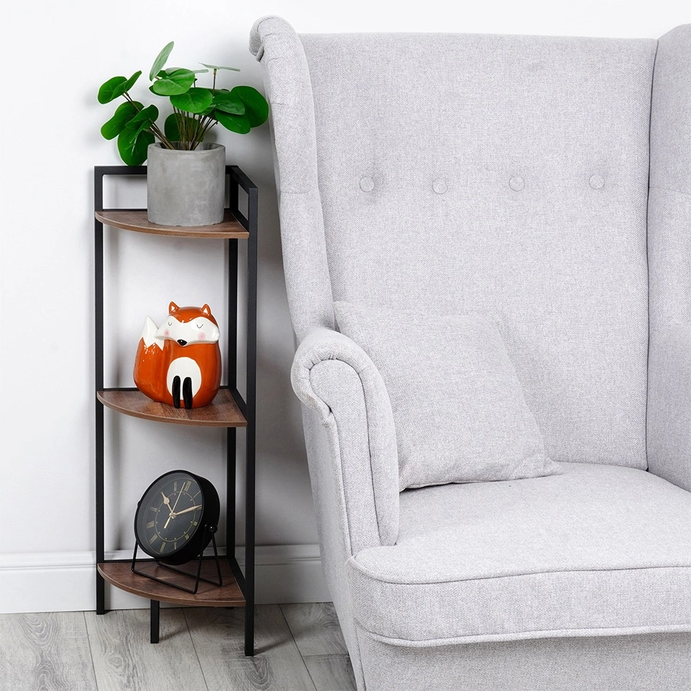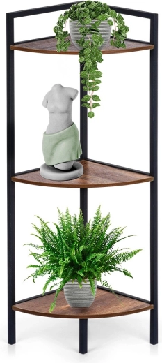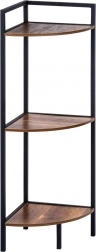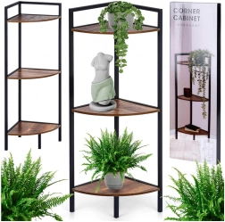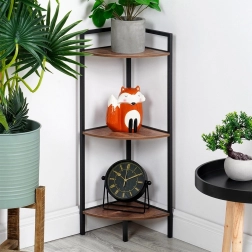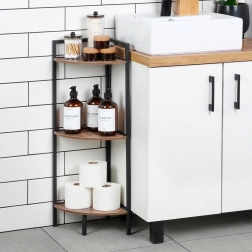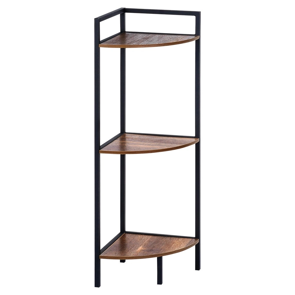 Elegancki narożny regał z trzema półkami oszczędza miejsce i oferuje praktyczne pionowe przechowywanie dla dekoracji, książek czy kosmetyków. Stabilna metalowa konstrukcja w czarnym kolorze oraz półki z płyty MDF w dekorze drewna pasują do każdego wnętrza. Dzięki kątowi prostemu 90° idealnie przylega do rogu i znajduje uniwersalne zastosowanie w salonie, kuchni i łazience.