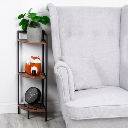 Narożny regał o wymiarach 23,5 × 23,5 × 76 cm to sprytne rozwiązanie do małych i większych przestrzeni. Minimalistyczny design w połączeniu czarnego metalu i dekoru drewna wygląda lekko i nowocześnie, a trzy pojemne półki zapewniają uporządkowane przechowywanie i stylową prezentację ulubionych przedmiotów.