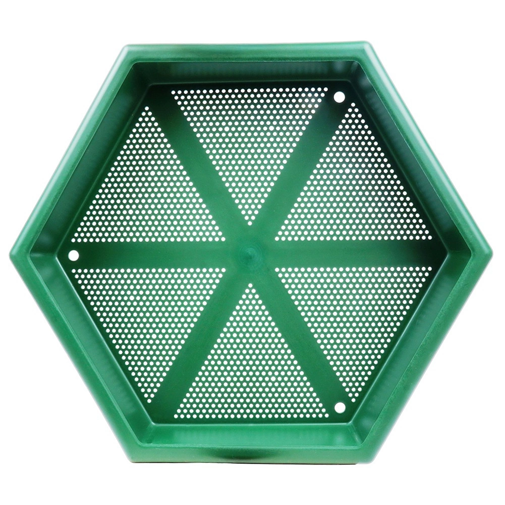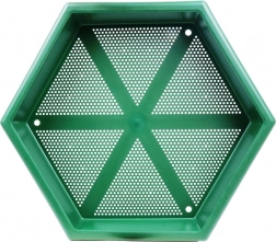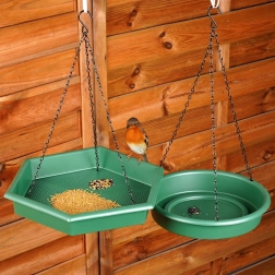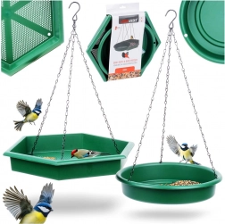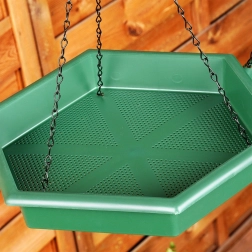 Sześciokątny podajnik z perforowanym dnem odprowadza wodę deszczową i ogranicza pleśnienie nasion. Idealny do całorocznego dokarmiania.