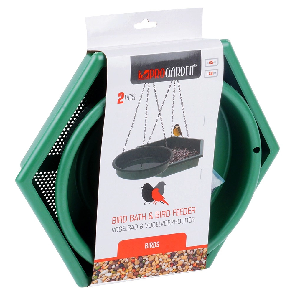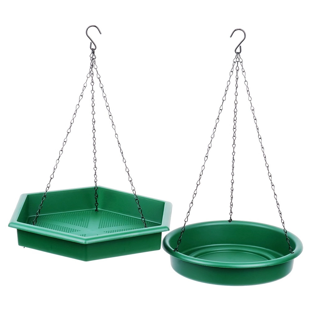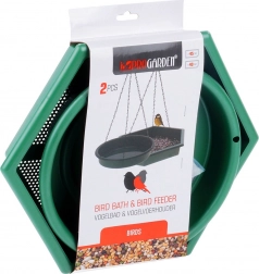 Zestaw 2w1 łączy przestronny karmnik (ok. 32 × 28 cm) z perforowanym dnem do odprowadzania wody oraz okrągłe poidełko (średnica ok. 25 cm) na świeżą wodę. Oba podajniki zawiesisz w kilka chwil na gałęzi, balkonie lub ogrodowym haku. Trwały plastik i mocne metalowe łańcuszki gwarantują długą żywotność i stabilność nawet przy zmiennej pogodzie.