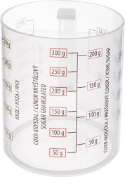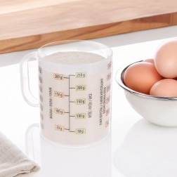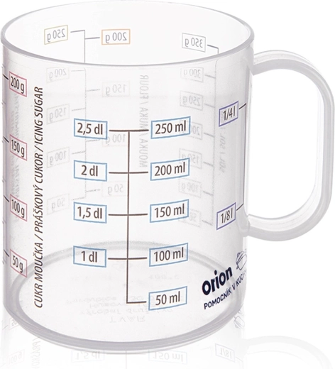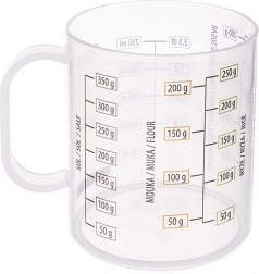Praktyczna kuchenne miarka w formie kubka o pojemności 250 ml do precyzyjnego odmierzania składników sypkich i płynnych. Dzięki czytelnej skali w l, ml i g łatwo odmierzysz mąkę, cukier, ryż, sól oraz płyny. Lekki i trwały materiał jest bezpieczny w kontakcie z żywnością, ergonomiczne ucho zapewnia wygodne użycie, a możliwość mycia w zmywarce ułatwia pielęgnację.