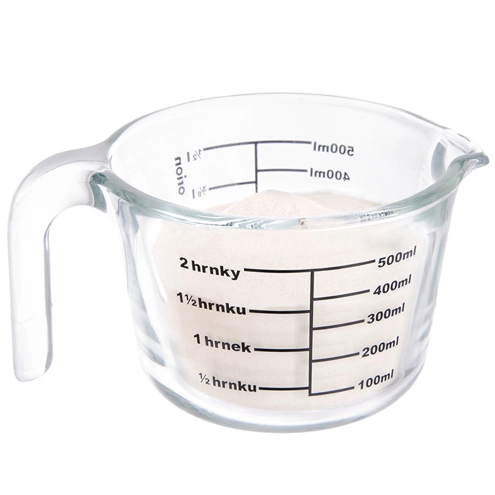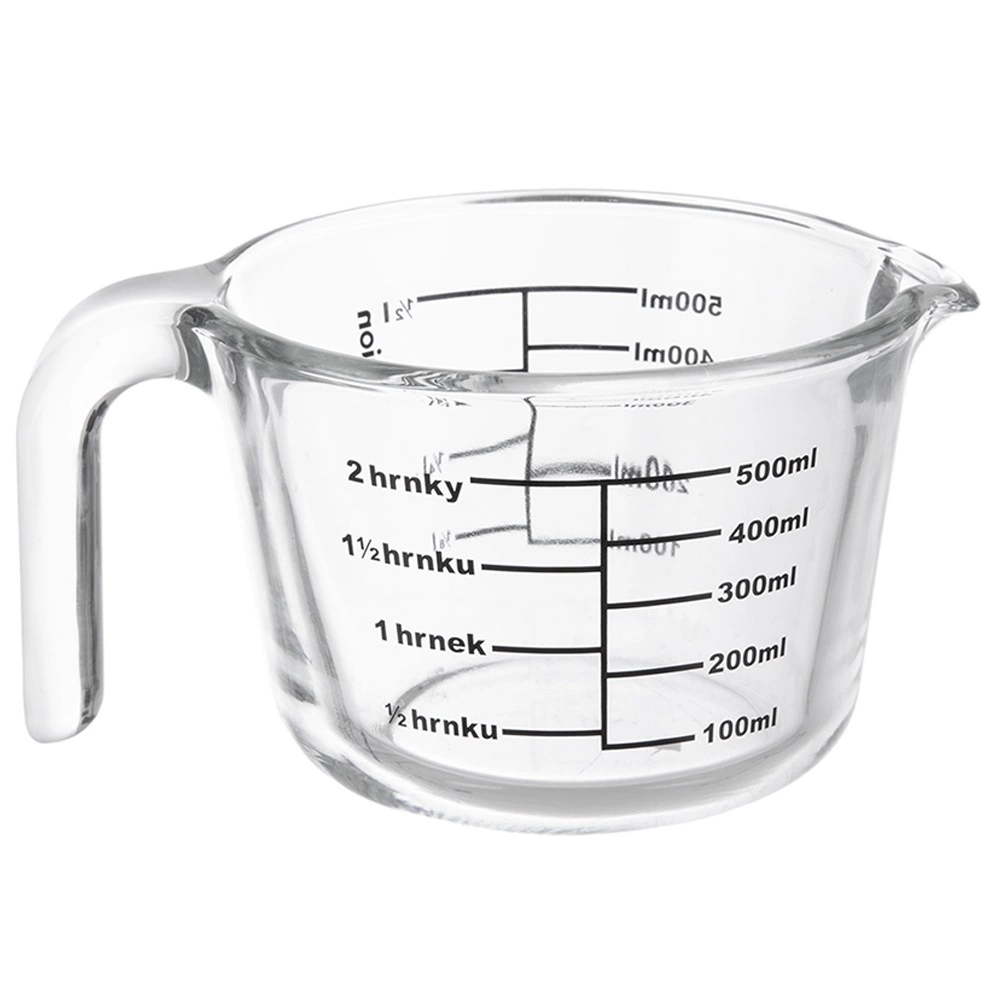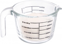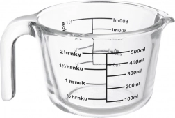 - Precyzyjna i przejrzysta skala w ml (100–500 ml co 100 ml), litrach (1/8 l do 1/2 l) oraz filiżankach (1/2 do 2).