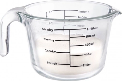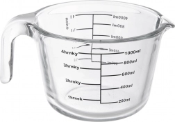 Miarka mierzy w mililitrach od 200 do 1000 ml (co 200 ml), w litrach od 1/4 l do 1 l oraz w filiżankach od 1 do 4. Odporne szkło borokrzemowe znosi ekstremalne różnice temperatur, więc miarkę można włożyć do lodówki, kuchenki mikrofalowej i piekarnika.