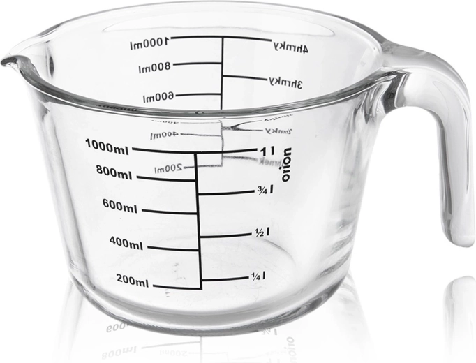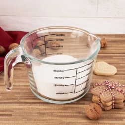 Ta miarka z wysokiej jakości szkła borokrzemowego to świetny pomocnik do precyzyjnego odmierzania płynnych i sypkich składników. Dzięki ergonomicznemu uchwytowi i praktycznemu dzióbkowi przelejesz składniki bez kropel i bałaganu. Czarna, wyraźnie zaznaczona skala zapewnia łatwą czytelność podczas gotowania i pieczenia.