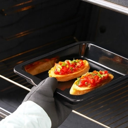 Gładka, błyszcząca powierzchnia ułatwia wyjmowanie potraw i można ją myć w zmywarce. Odpowiednia do piekarników elektrycznych i gazowych.
