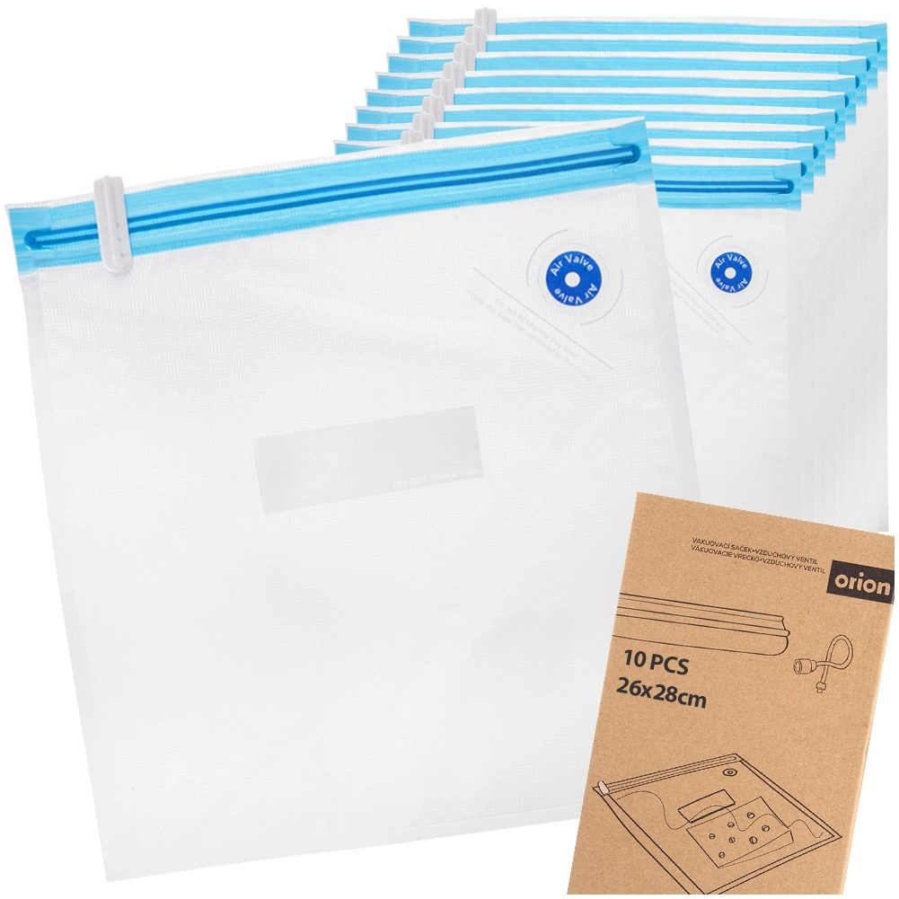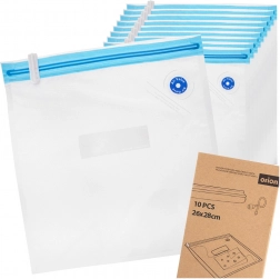 Jedna strona woreczka jest gładka, druga ma specjalną strukturę dla szybkiego i równomiernego odsysania. Zestaw zawiera 10 sztuk oraz 2 przesuwne zamykacze dla łatwego i szczelnego domknięcia. Idealne do mięsa, warzyw, serów, pieczywa, orzechów i gotowych posiłków – w domu i w podróży.
