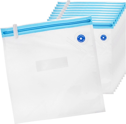 Utrzymaj swoją żywność dłużej świeżą i perfekcyjnie zorganizowaną. Wielokrotnego użytku woreczki próżniowe 26 × 28 cm z podwójnym zamkiem i zaworem do odsysania chronią przed powietrzem, wilgocią i zapachami. Nadają się do lodówki i zamrażarki, a dzięki wytrzymałej folii nylonowej bez BPA wytrzymują temperatury od −20 °C do +110 °C.