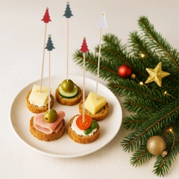 Ożyw świąteczny stół dekoracyjnymi wykałaczkami z motywem choinki w kolorach czerwonym, zielonym i białym z żółtą gwiazdką. Są idealne do serwowania słonych i słodkich smakołyków; dzięki mocnym końcówkom łatwo nadziewają i utrzymują kawałki razem.