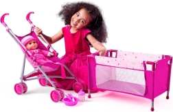 Ten piękny zestaw zawiera wszystko, czego Twoje dziecko potrzebuje do opieki nad swoją ulubioną lalką. Zawiera sportowy wózek z metalową konstrukcją, który jest wyjątkowo praktyczny dzięki łatwej obsłudze. Do zestawu dołączone jest również łóżeczko podróżne, idealne do zabawy w domu i na świeżym powietrzu.