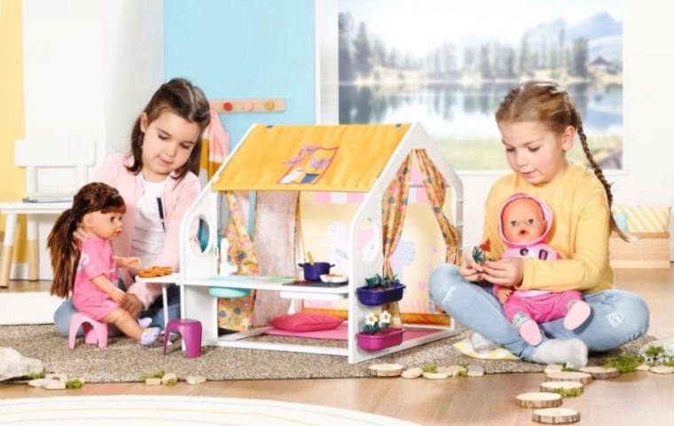 Dzięki pomalowanym ścianom i dopracowanym dekoracjom domek pozwala dzieciom przeżyć luksusowe doświadczenie glampingu z lalkami BABY born.