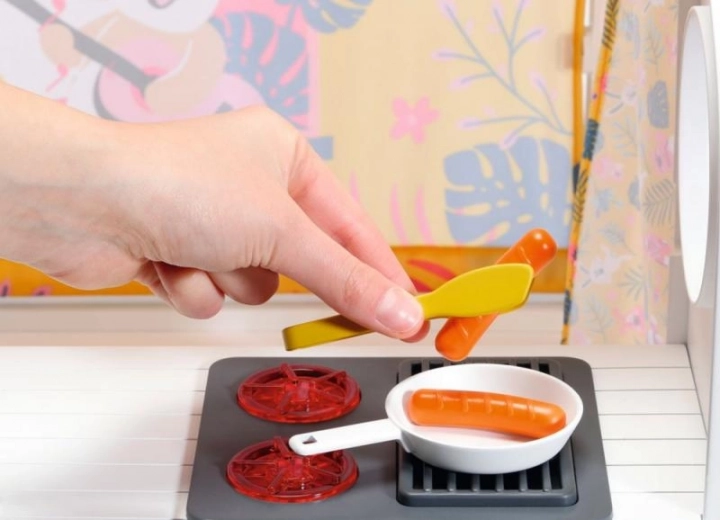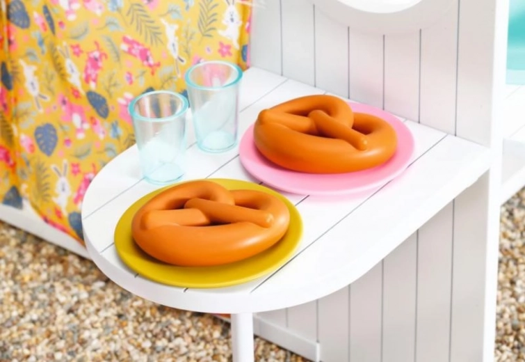 Oprócz zabawnego serwowania posiłków dzieci mogą wykorzystać domek do oglądania zachodów słońca i układania lalek do snu w kąciku sypialnym z różowymi dodatkami.