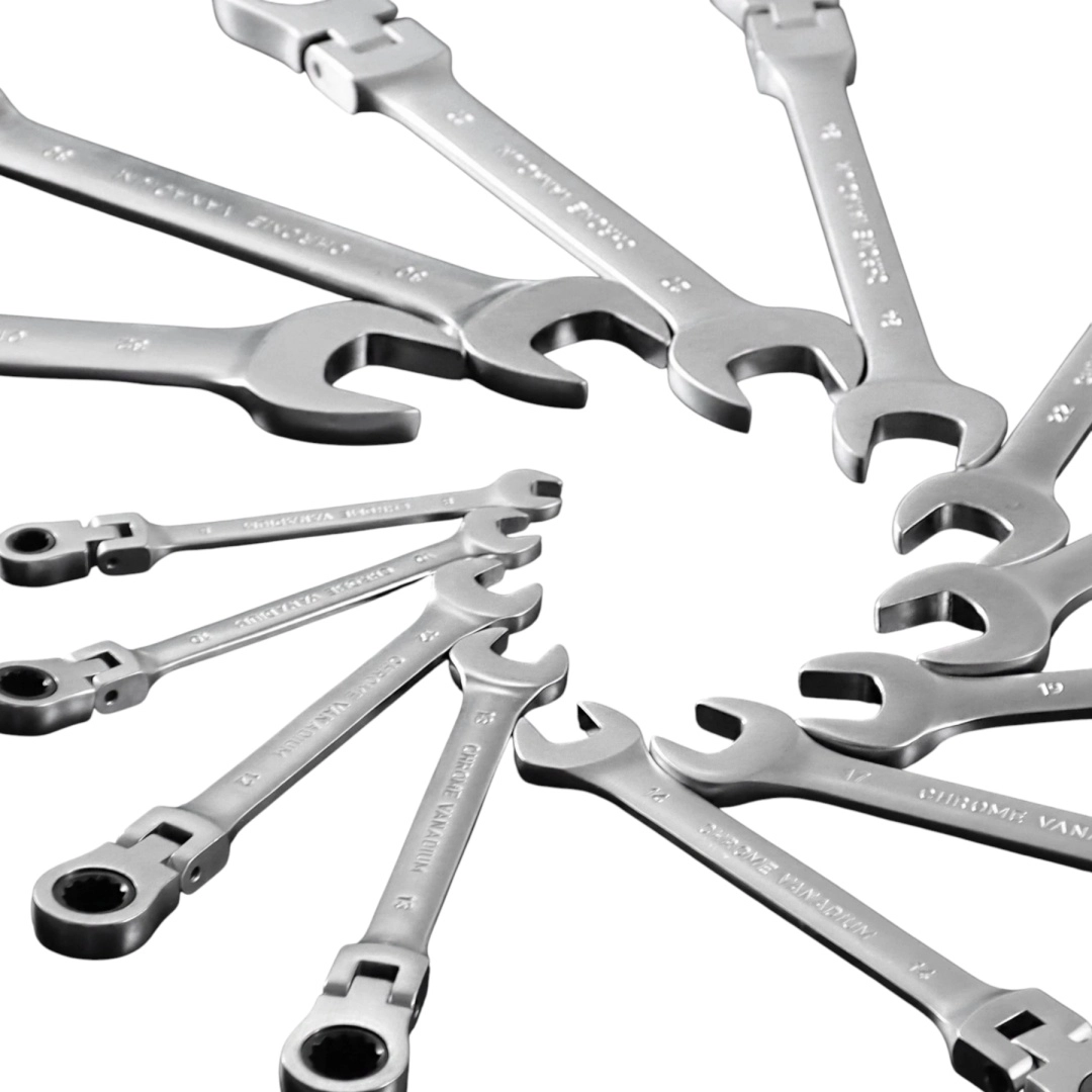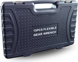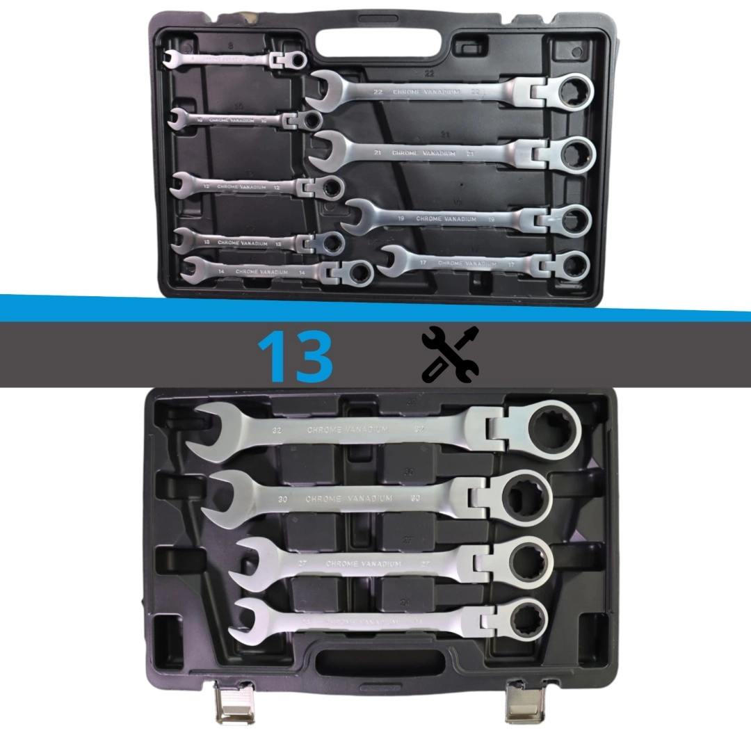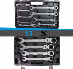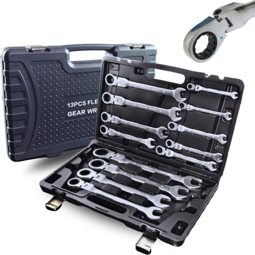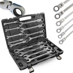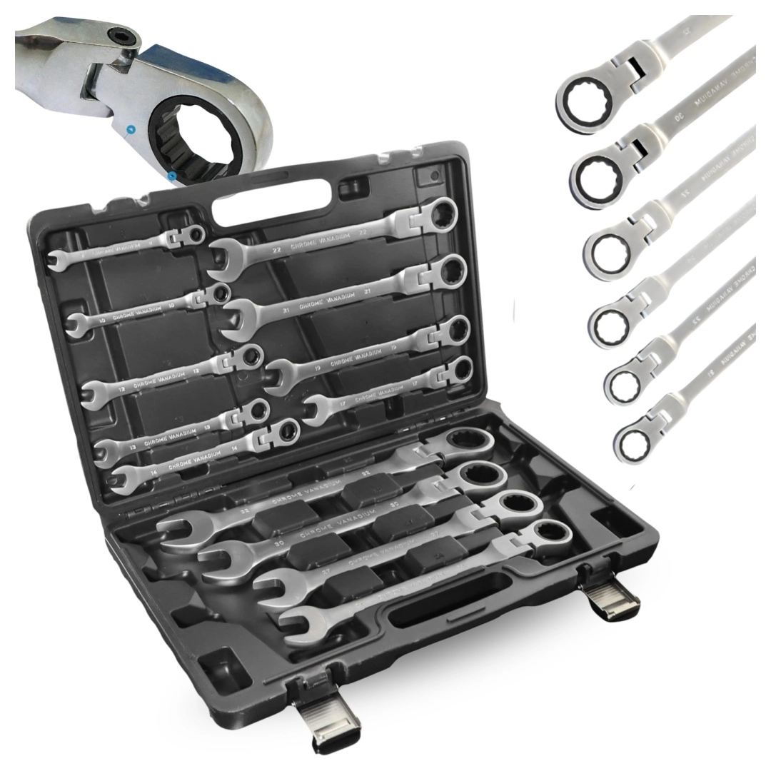 Profesjonalny zestaw 13 elastycznych kluczy oczkowo‑grzechotkowych do szybkiego dokręcania i odkręcania śrub nawet w ciasnych przestrzeniach. Obrotowe, przegubowe głowice, precyzyjny mechanizm grzechotkowy oraz wytrzymała stal chromowo‑wanadowa (CrV) zapewniają długą żywotność, dokładność i wygodę pracy. W zestawie solidna plastikowa walizka do bezpiecznego przechowywania i transportu.