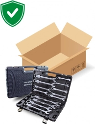 Klucze wykonane są ze stali chromowo‑wanadowej (CrV), odpornej na zużycie, korozję i odkształcenia. Ergonomiczny kształt zapewnia pewny chwyt i efektywne przenoszenie siły, a wytrzymała walizka transportowa utrzymuje narzędzia w porządku i chroni je podczas przewozu.