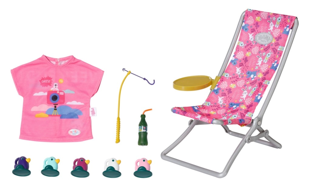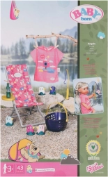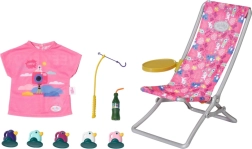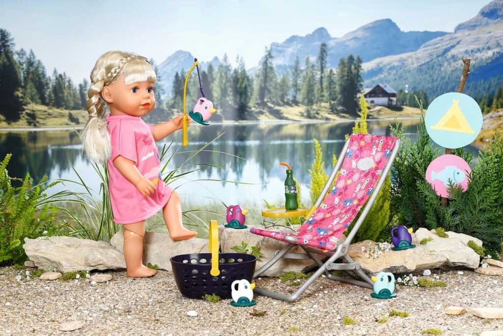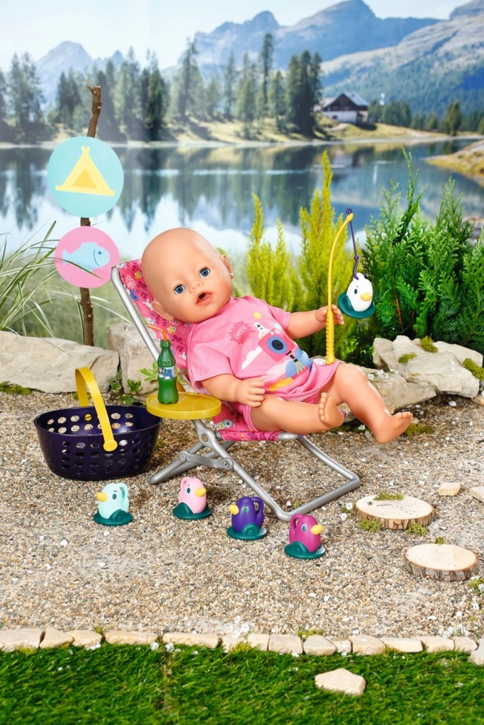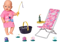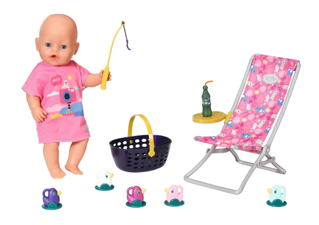BABY born Weekendowy zestaw wędkarski zawiera ubranko, leżak ze stolikiem, butelkę lemoniady, koszyczek, 5 kaczuszek i wędkę.