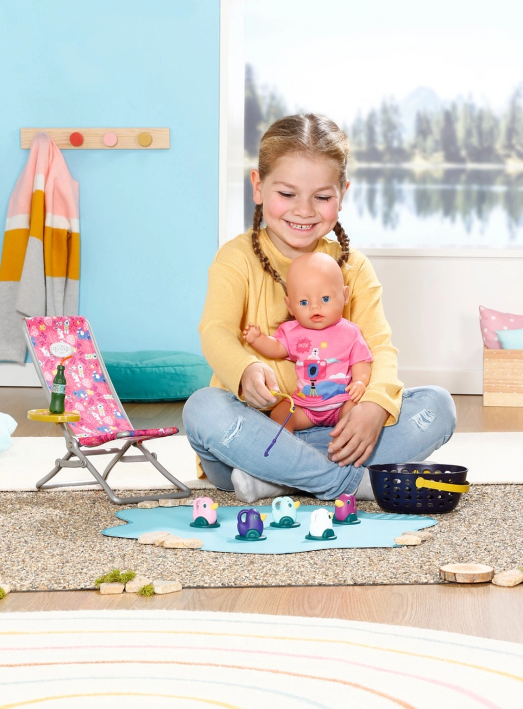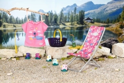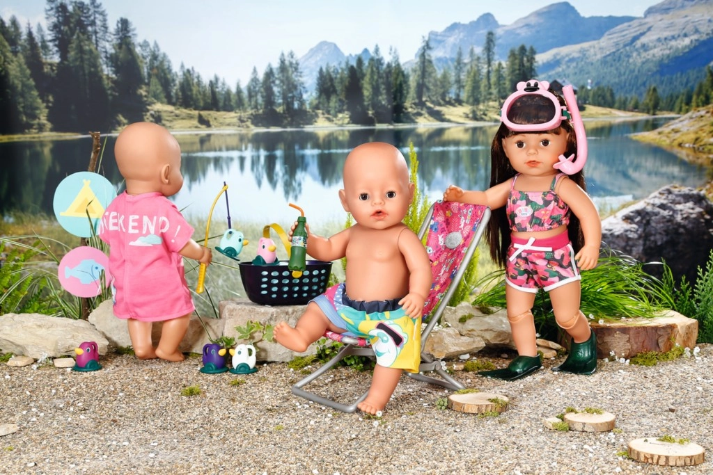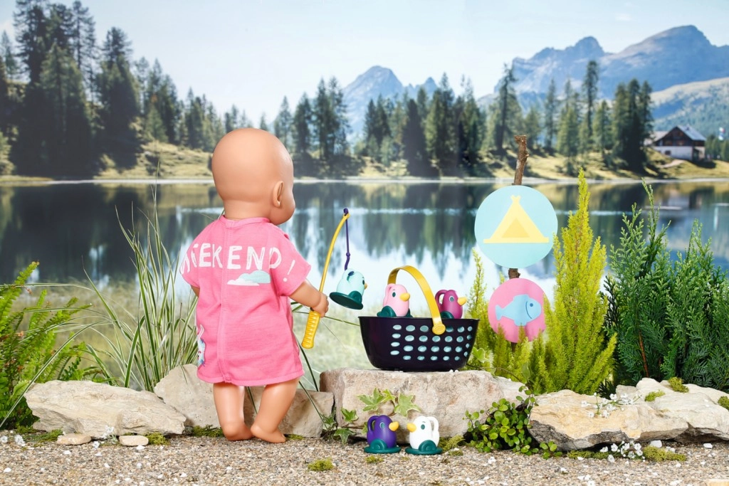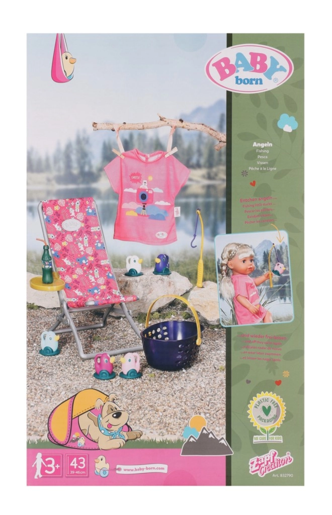 BABY born Weekendowy zestaw wędkarski zawiera ubranko, leżak ze stolikiem, butelkę lemoniady, koszyczek, 5 kaczuszek i wędkę.