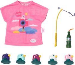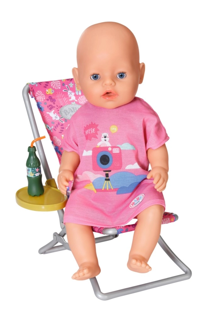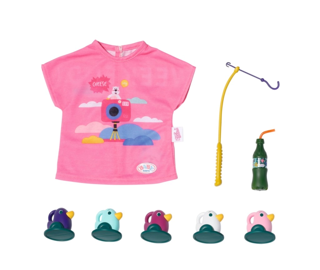 „W morzu jest o wiele więcej ryb…” Ale BABY born woli łapać urocze kaczuszki. Siedząc wygodnie w różowym leżaku z kolorowym wzorem, próbuje zahaczyć na haczyk wędki jedną z pięciu kaczuszek. Od czasu do czasu popija lemoniadę, którą ma odstawioną na żółtym stoliku przy leżaku. Gdy wyłowi wszystkie kaczuszki i schowa je do niebieskiego koszyka, odkłada je z powrotem do stawu i zabawna gra może zacząć się od nowa. Do tej zabawy w wędkowanie BABY born założyła luźną, długą różową koszulkę z uroczym nadrukiem.