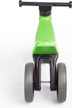 O bezpieczeństwo dba ograniczony zakres skrętu widelca, poszerzone końcówki gripów chronią dłonie, a szerokie koła zapewniają stabilność. Lekka konstrukcja (tylko 1,9 kg) ułatwia przenoszenie i obsługę. Jeździk pomaga rozwijać motorykę, równowagę i koordynację, zachęcając dzieci do dłuższych i bardziej angażujących spacerów.
