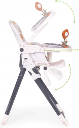 Szeroka, regulowana tacka z zdejmowaną górną warstwą łatwo się czyści. Zintegrowana grzechotka i obrotowa zabawka zajmą dziecko podczas oczekiwania na posiłek i rozwijają motorykę małą.