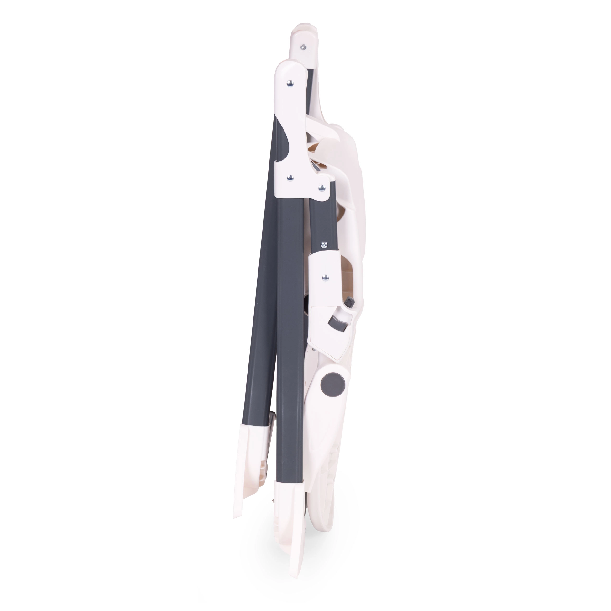 Stabilna stalowa rama, 3‑punktowe pasy i ogranicznik krokowy utrzymują dziecko w bezpiecznej pozycji. Regulowana tacka i podnóżek dopasowują się do wzrostu dziecka, zapewniając komfort od 6 do 36 miesięcy. Składana konstrukcja oszczędza miejsce w domu i ułatwia transport.