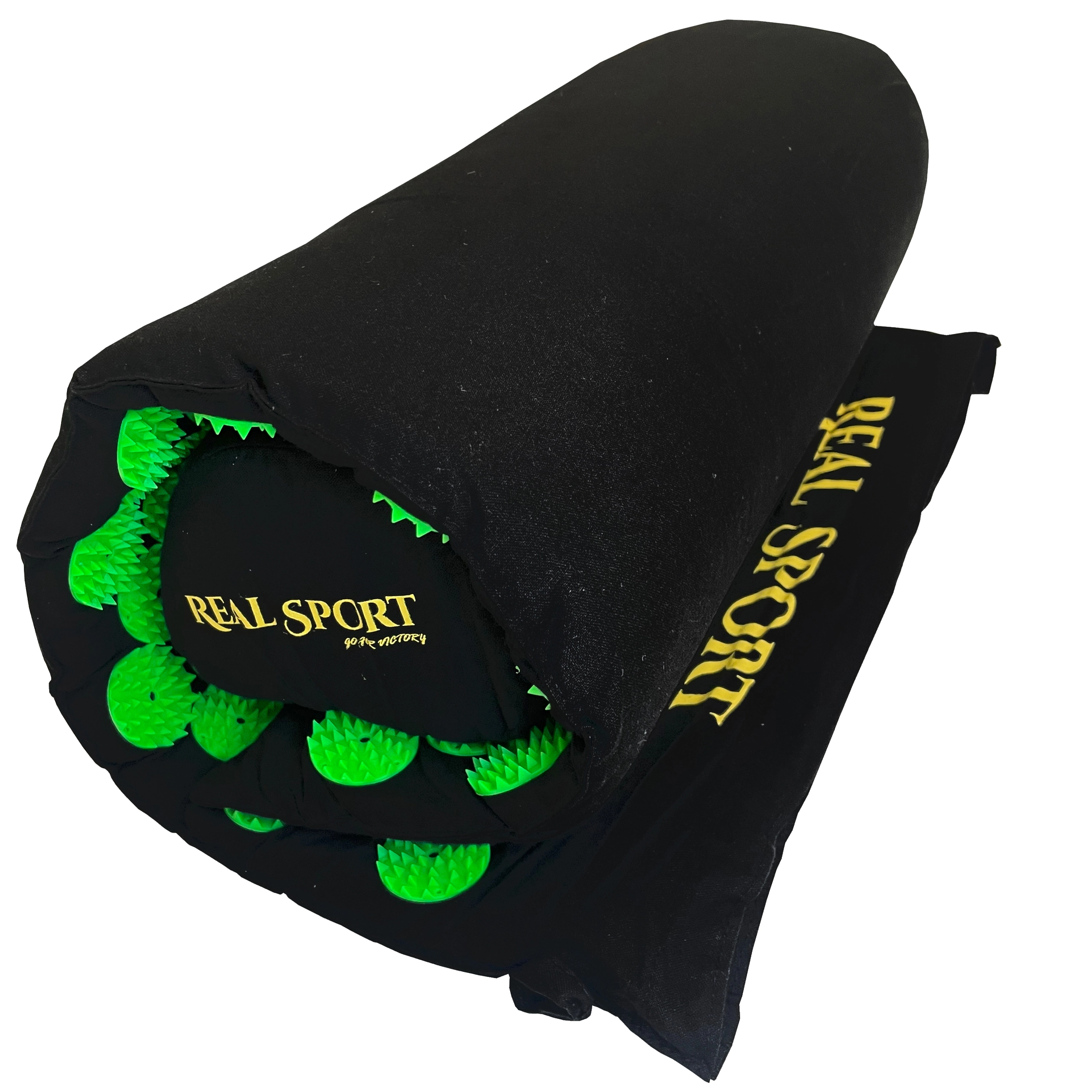 Zielone dyski z kolcami aktywują punkty uciskowe na całej długości pleców i na szyi, wspierając rozluźnienie mięśni oraz lepsze ukrwienie.