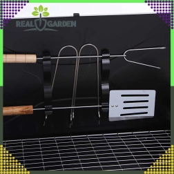 Dzięki otworom wentylacyjnym spalanie węgla jest wydajniejsze, a potrawy przygotujesz szybciej i bardziej równomiernie. Po bokach znajdziesz praktyczne uchwyty ułatwiające przenoszenie. W opakowaniu otrzymasz także podstawowe akcesoria – łopatkę, szczypce i szpikulec, by móc rozpocząć grillowanie od razu.