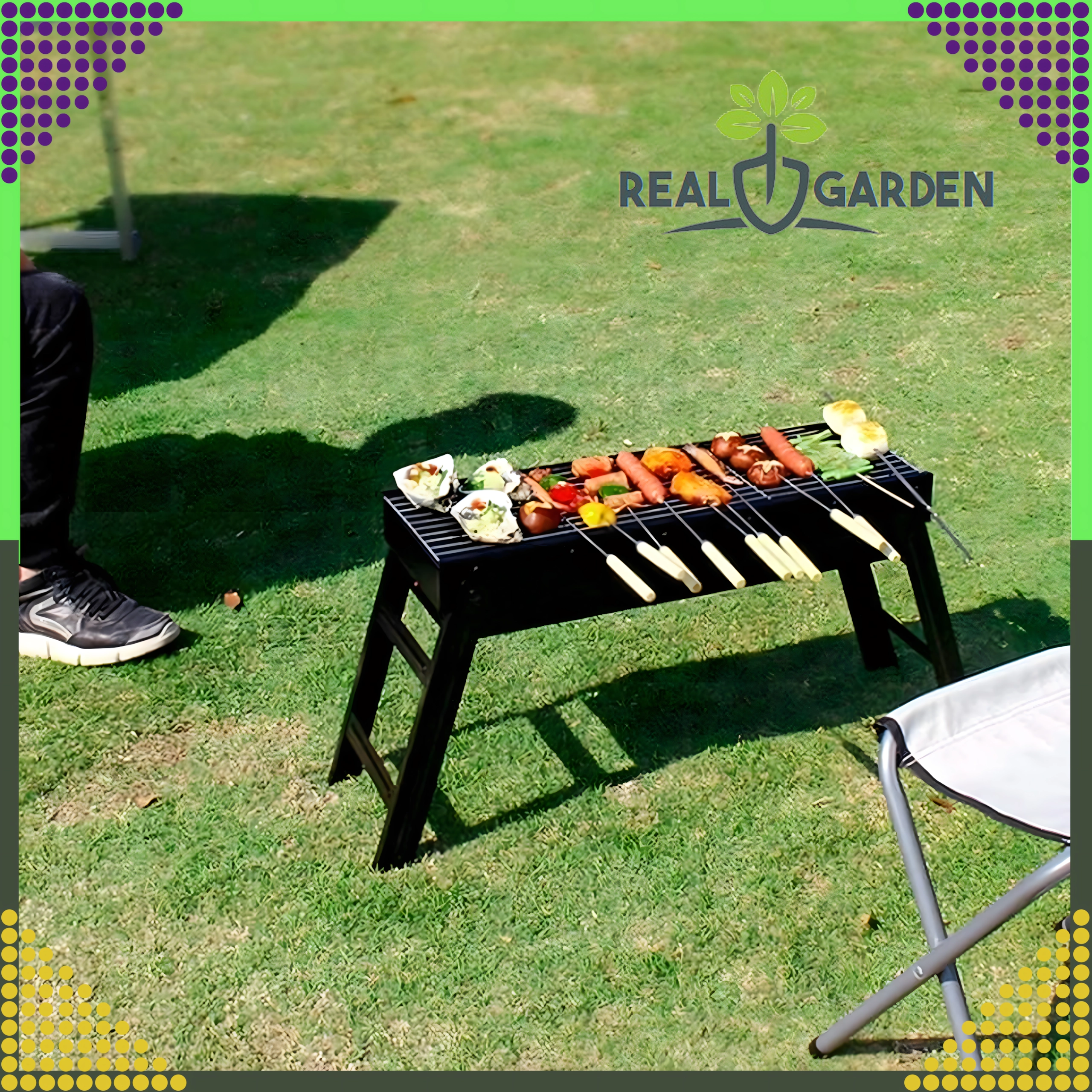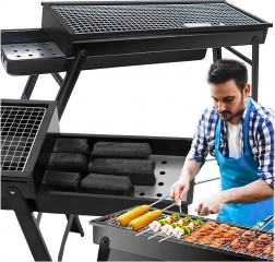 Ten przenośny, składany grill z malowanej proszkowo stali w kolorze czarnym został zaprojektowany do szybkiego i wygodnego grillowania na łonie natury, w ogrodzie i na tarasie. Dzięki lekkiej konstrukcji i składanym nogom w kilka sekund przygotujesz go do pracy, a po grillowaniu łatwo schowasz lub przewieziesz.