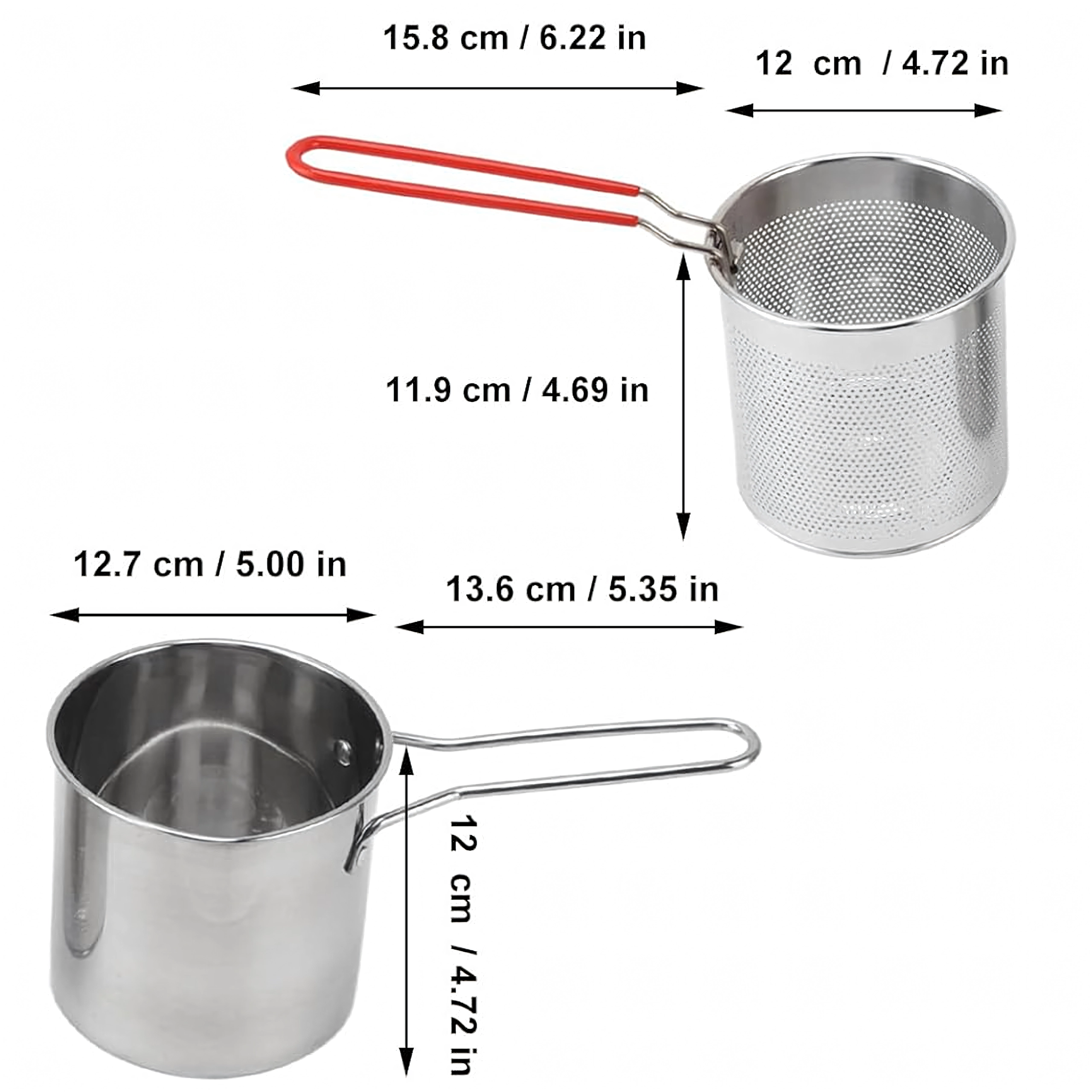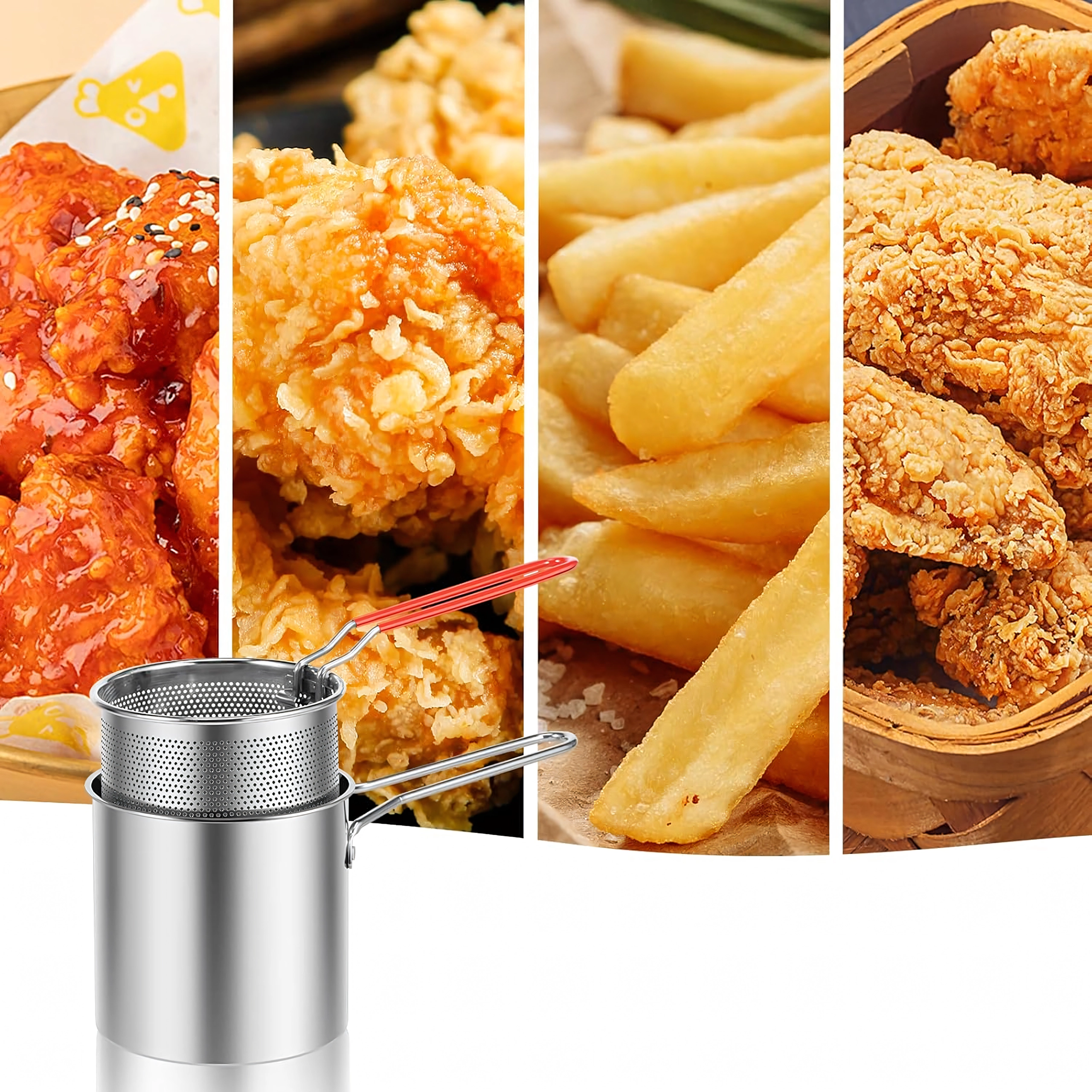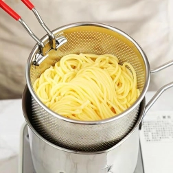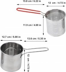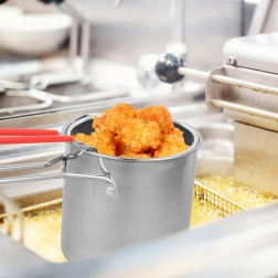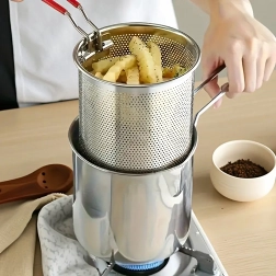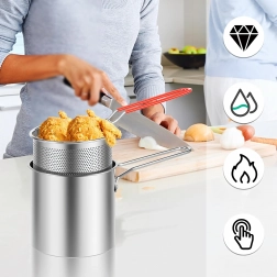 Praktyczny mini garnek z koszykiem do frytowania zapewnia bezpieczne i czyste smażenie ulubionych przysmaków – od frytek i kawałków kurczaka po warzywa. Drobno perforowany kosz umożliwia szybkie ociekanie oleju, dzięki czemu potrawy są chrupiące i mniej tłuste. Stal nierdzewna 304 gwarantuje długą żywotność, łatwą pielęgnację i neutralny smak.