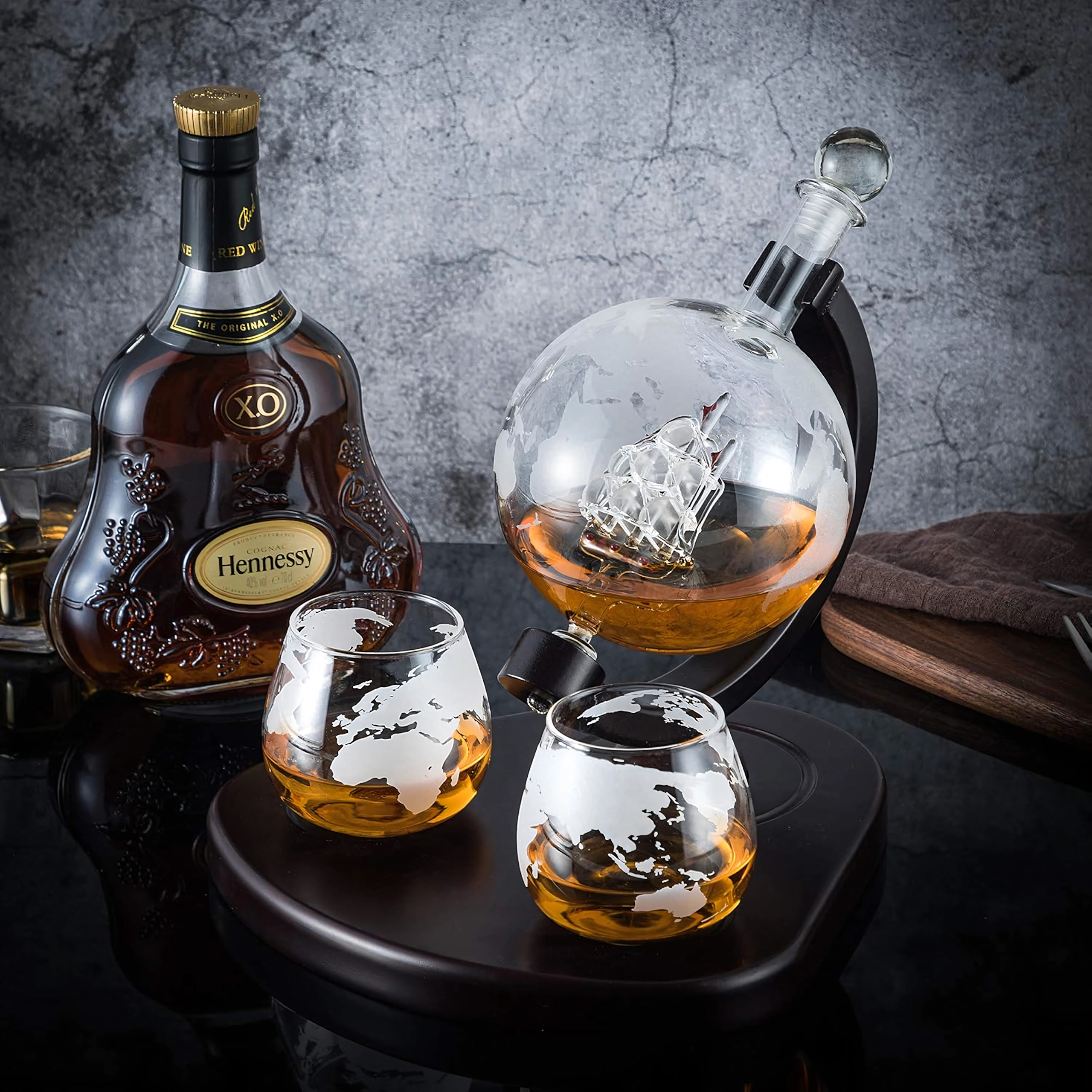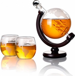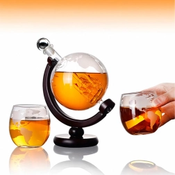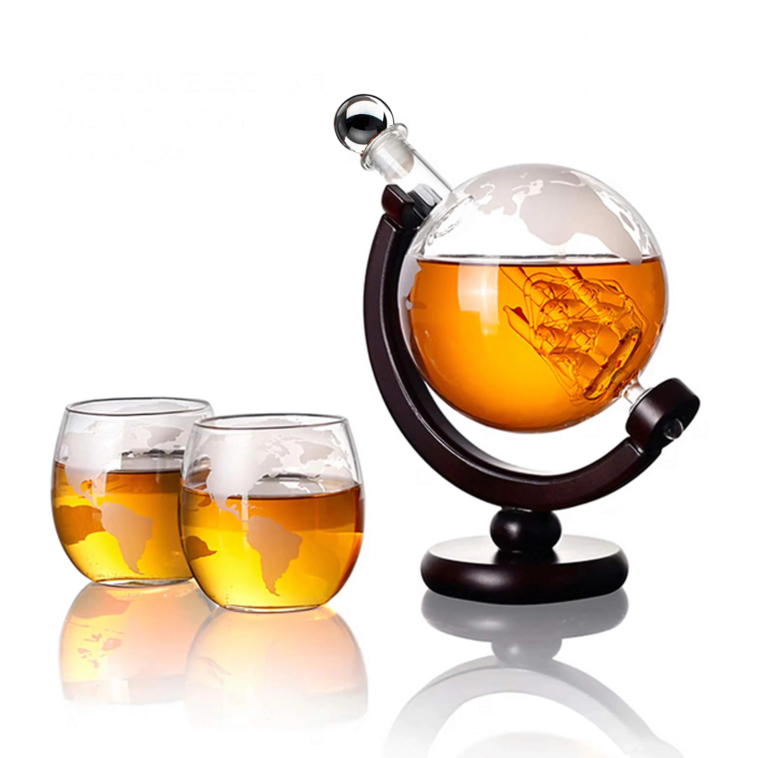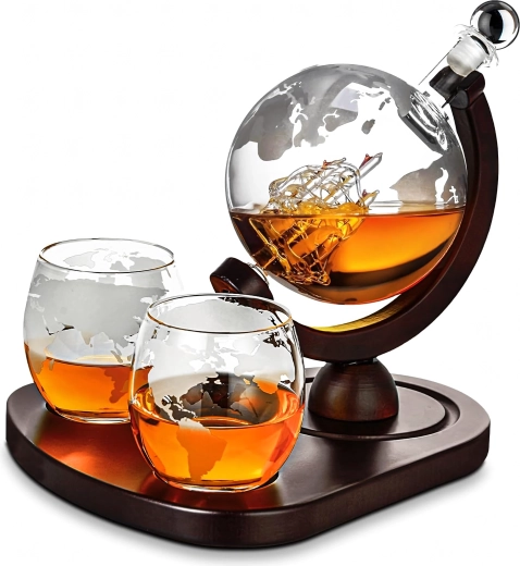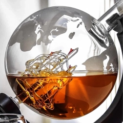 Odkryj wyjątkowe połączenie designu i funkcjonalności. Karafa o pojemności 850 ml spoczywa na ciemnej drewnianej podstawie, która umożliwia wygodne przechylanie i serwowanie. Wewnątrz znajduje się dekoracyjny szklany okręt, a ścianki zdobi delikatny grawer mapy świata, nadając zestawowi luksusowy charakter.