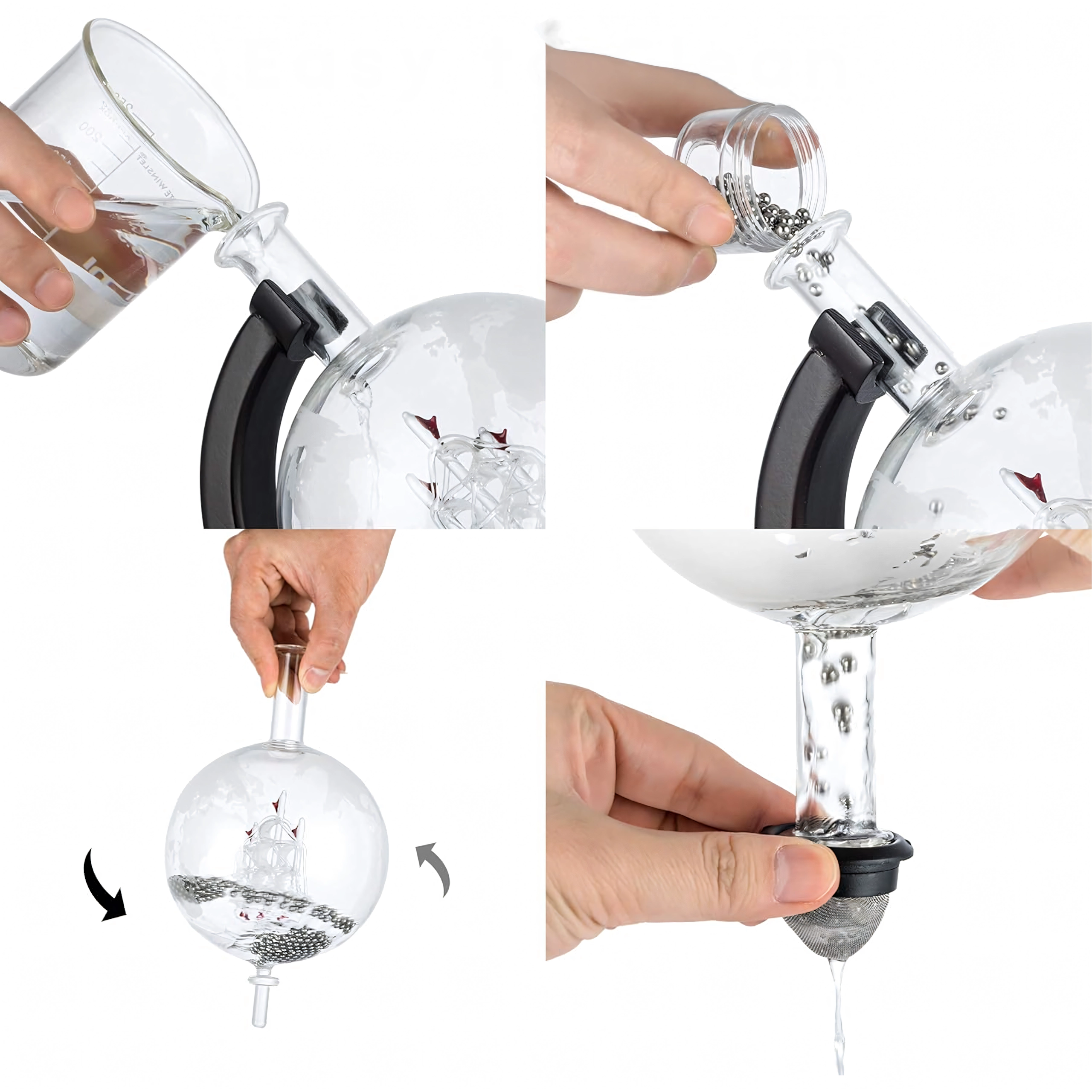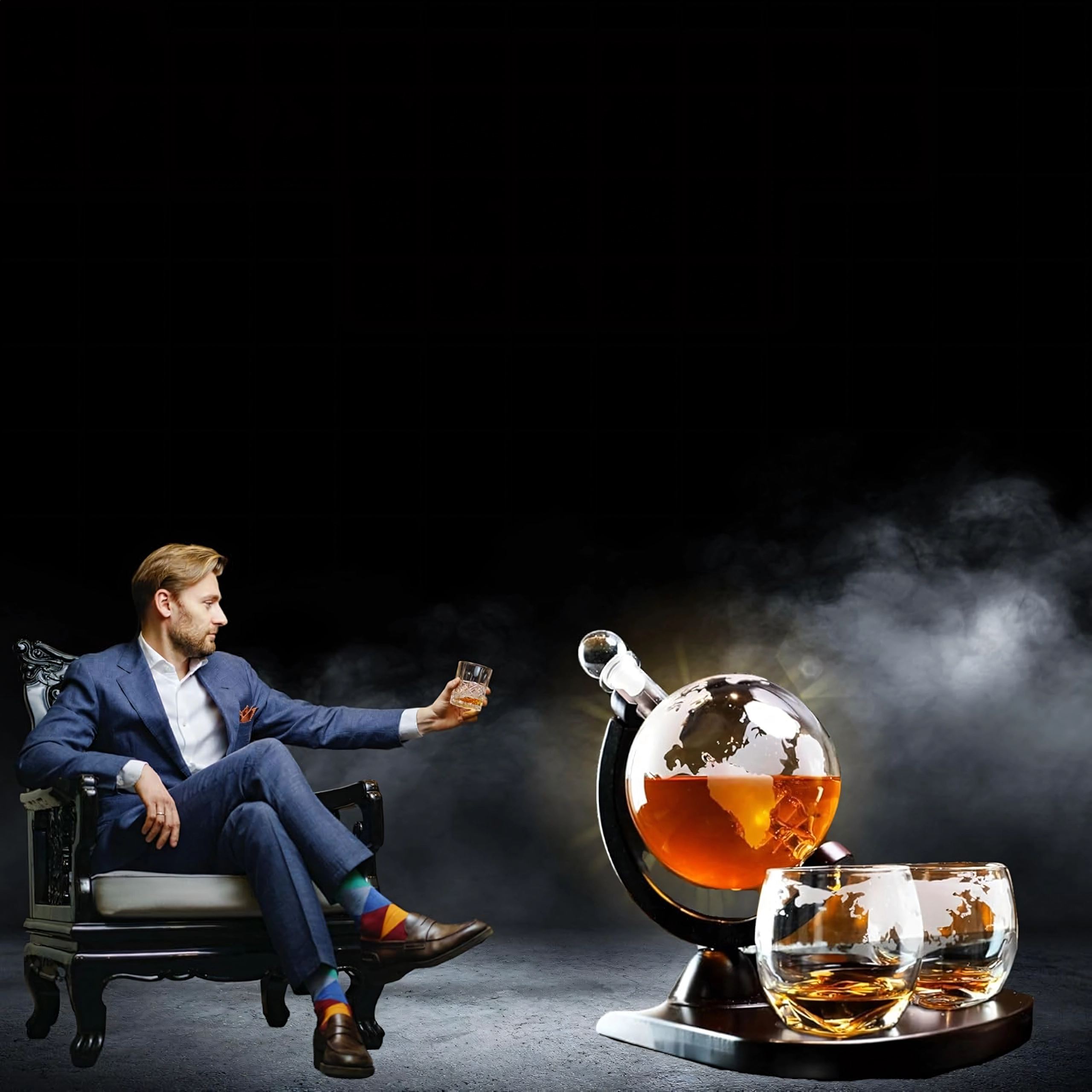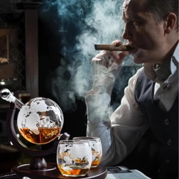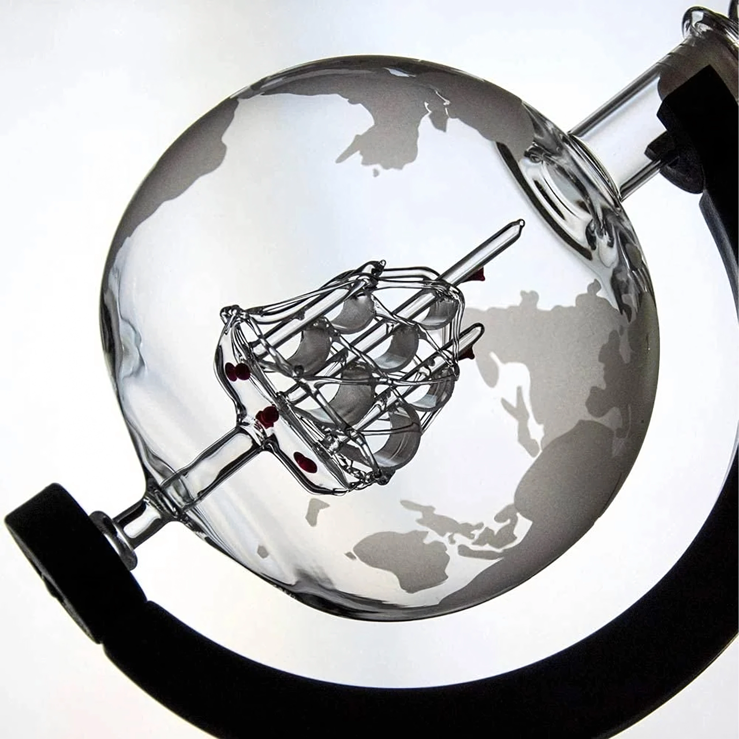 Odkryj wyjątkowe połączenie designu i funkcjonalności. Karafa o pojemności 850 ml spoczywa na ciemnej drewnianej podstawie, która umożliwia wygodne przechylanie i serwowanie. Wewnątrz znajduje się dekoracyjny szklany okręt, a ścianki zdobi delikatny grawer mapy świata, nadając zestawowi luksusowy charakter.