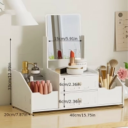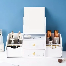 Praktyczny podział na wiele sekcji pozwala rozdzielić kosmetyki pielęgnacyjne, makijaż oraz biżuterię. Dwie szuflady pomieszczą drobiazgi, boczne przegródki są idealne na wyższe buteleczki i pędzle, a przednia sekcja utrzyma pomadki czy kredki w zasięgu ręki. Kompaktowe wymiary oszczędzają miejsce na toaletce i komodzie.