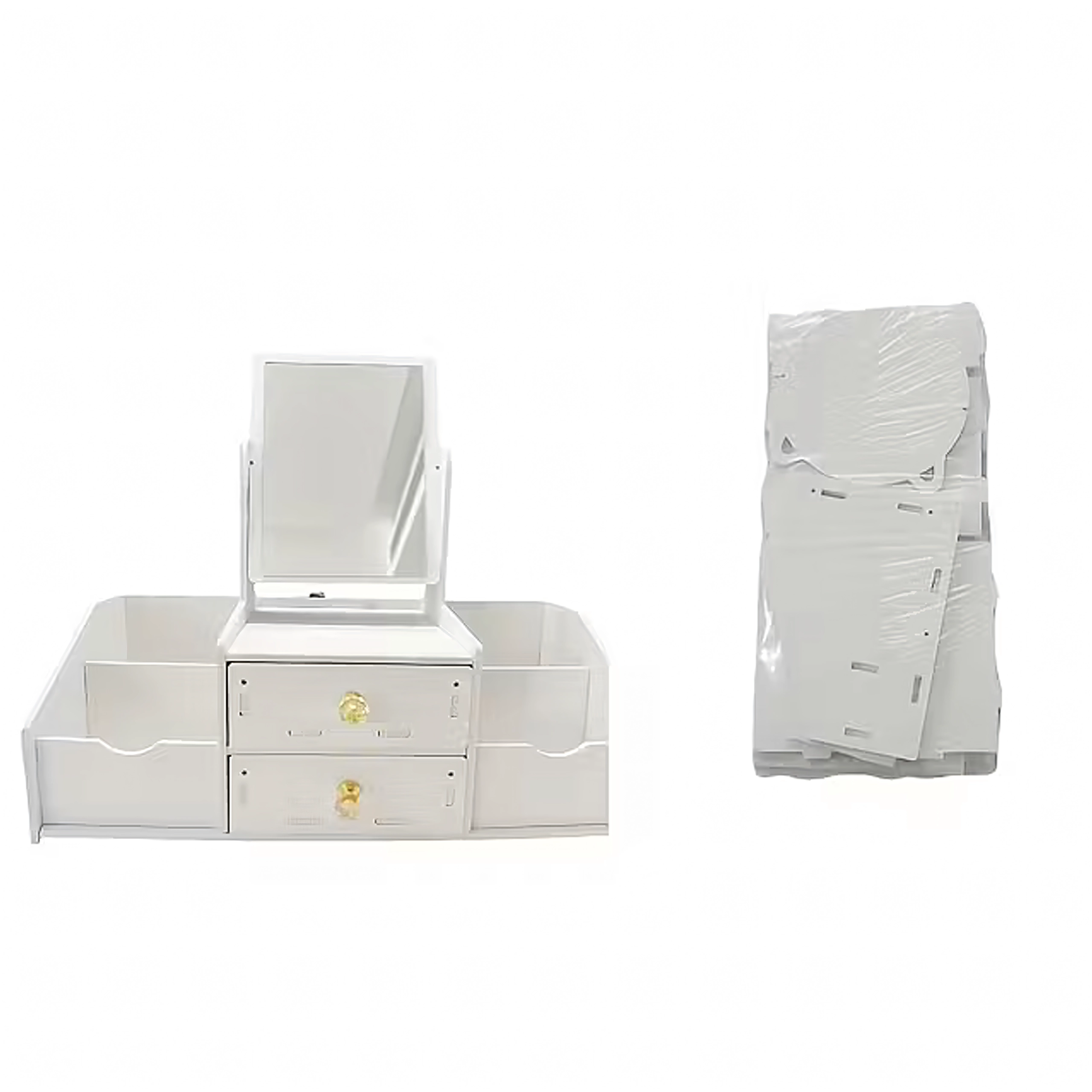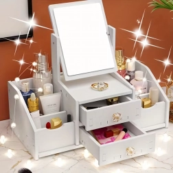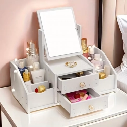 Ta mini toaletka łączy szkatułkę na biżuterię i organizer kosmetyczny w jednym. Składane lustro ułatwia codzienny makijaż i pielęgnację, a przemyślany układ sprawia, że buteleczki, pomadki i akcesoria pozostają bezpiecznie i przejrzyście uporządkowane. Czysty biały design łatwo wpasuje się zarówno w nowoczesne, jak i klasyczne wnętrza.