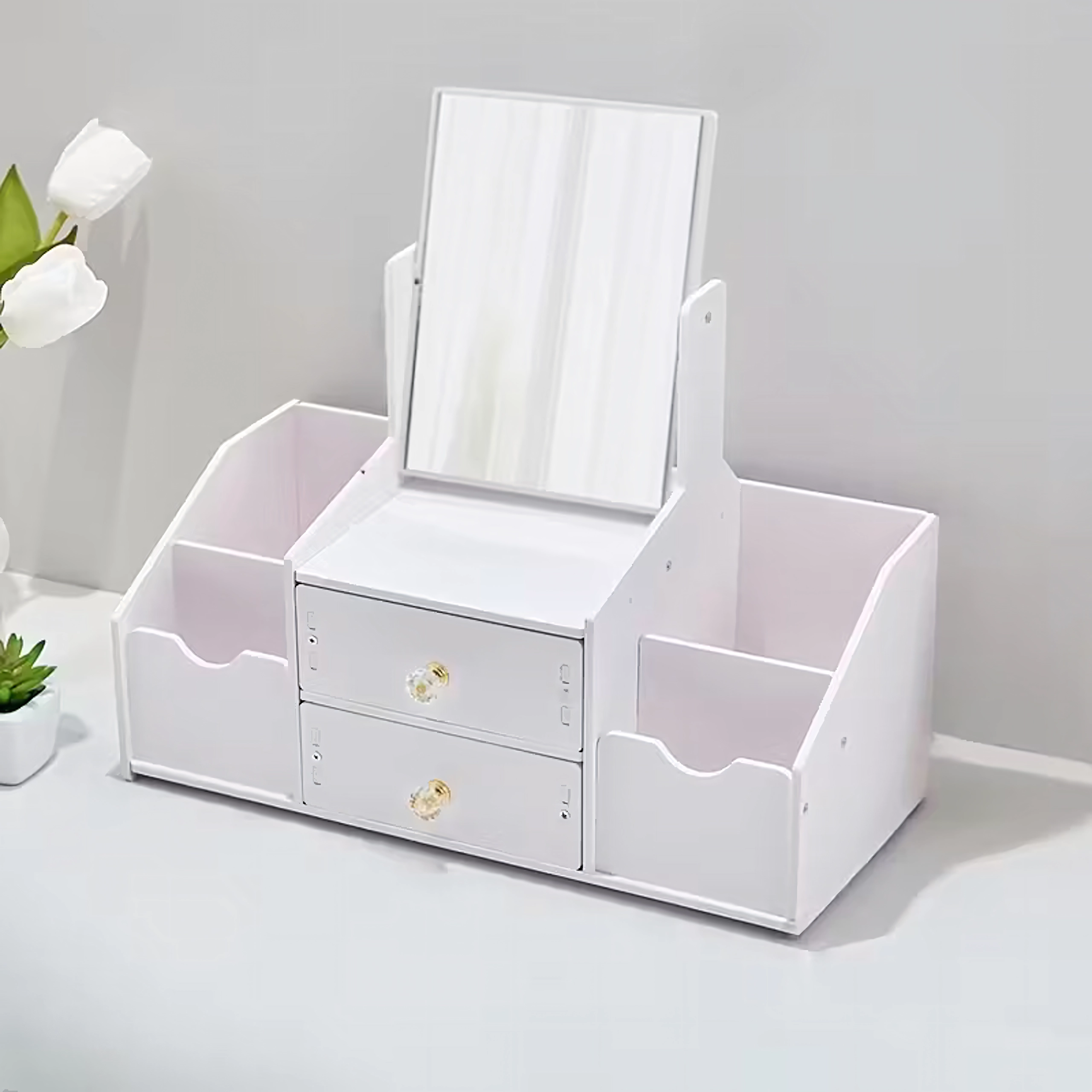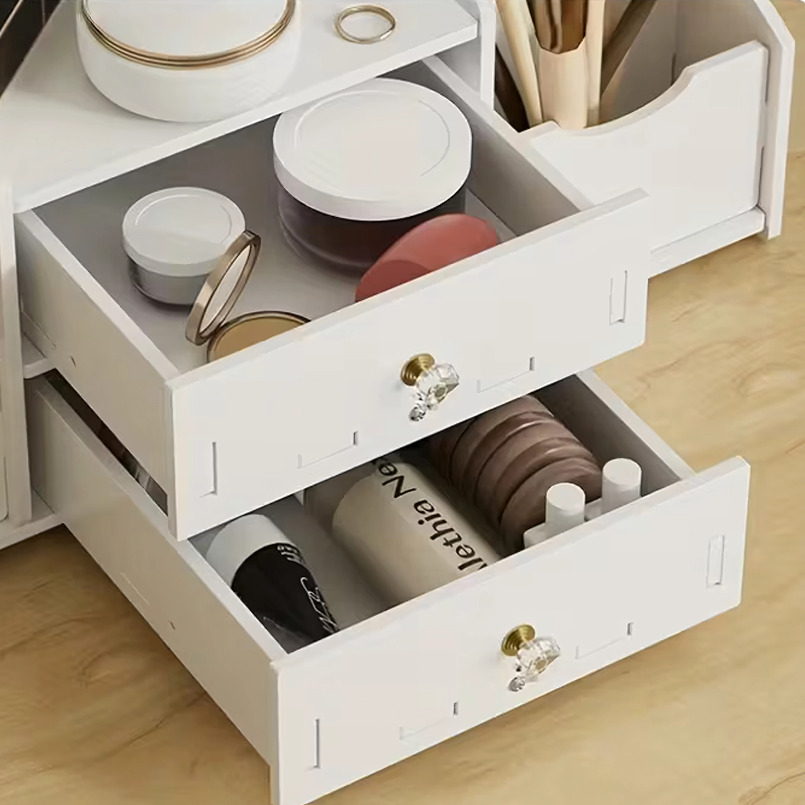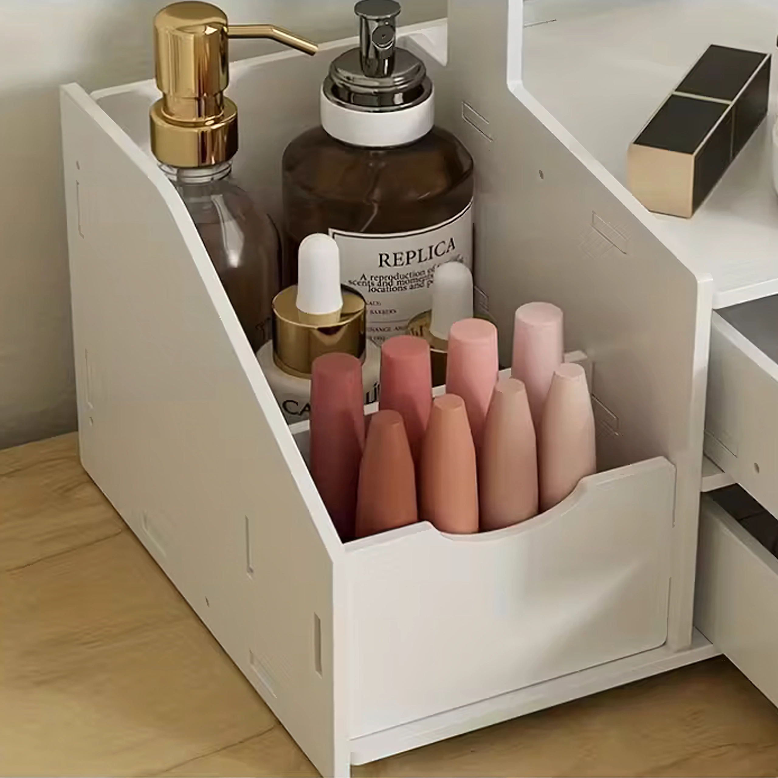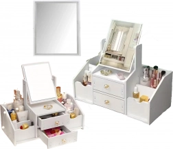 Boczne przegródki na buteleczki, przednia sekcja na pomadki oraz dwie szuflady na biżuterię i drobiazgi utrzymują porządek i przejrzystość.
