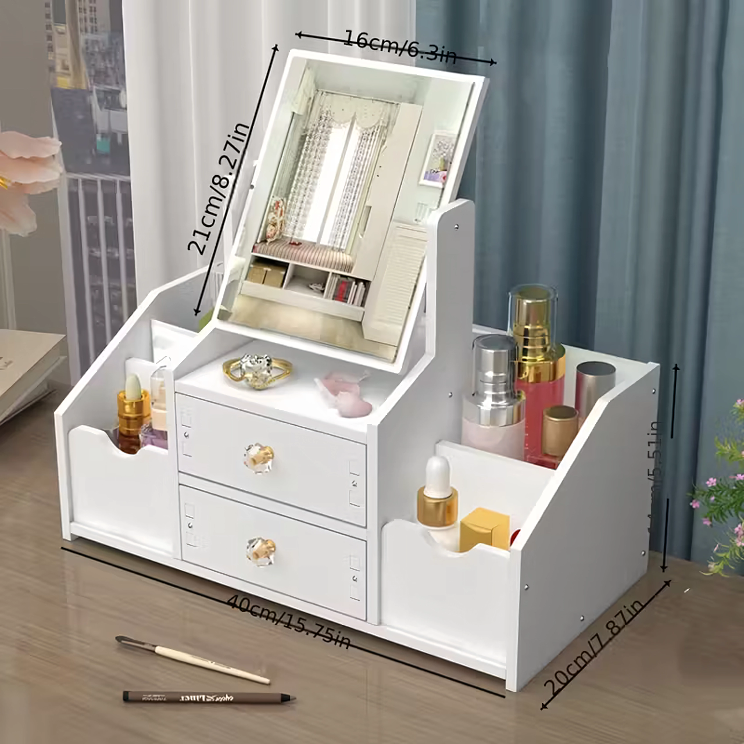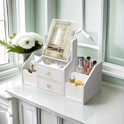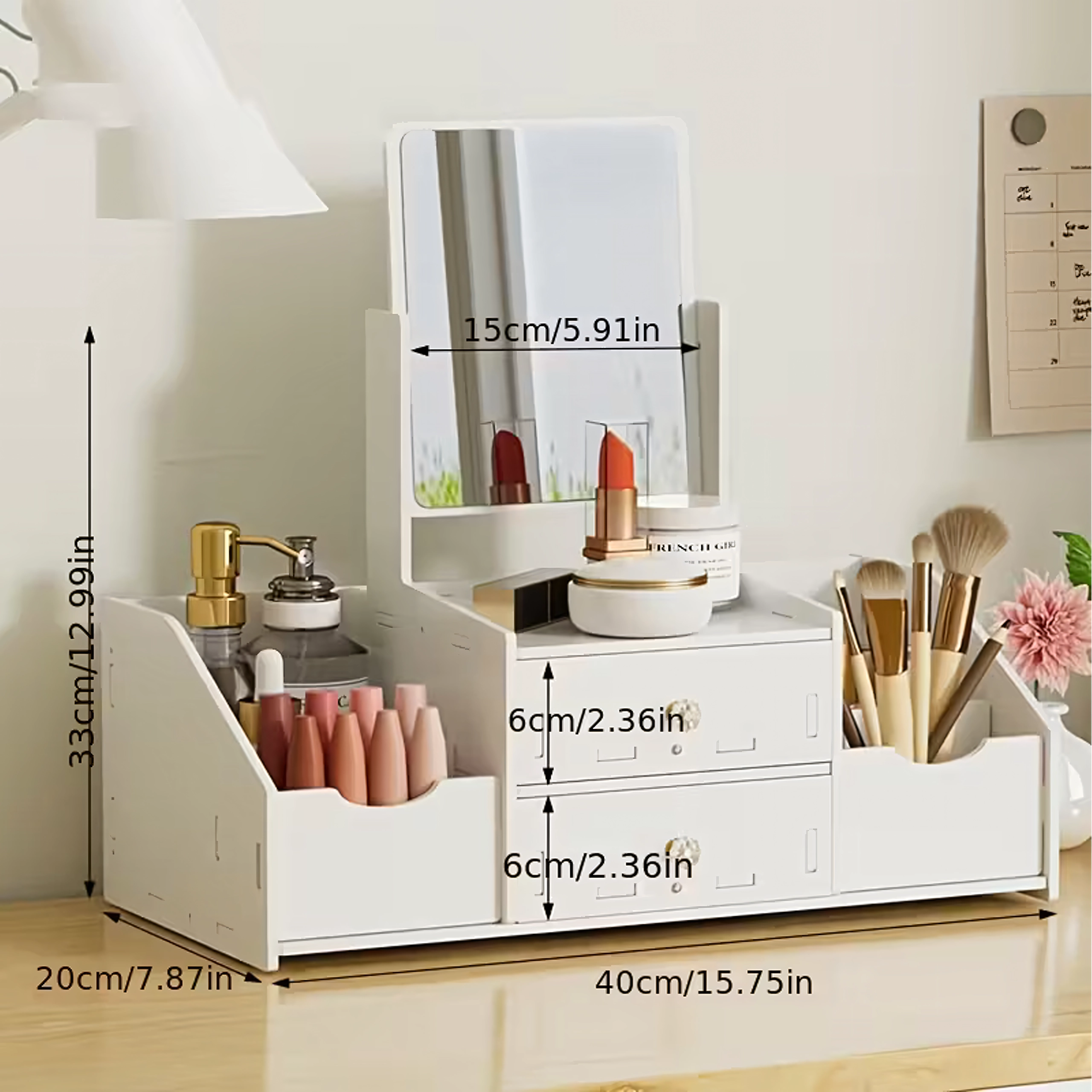 Boczne przegródki na buteleczki, przednia sekcja na pomadki oraz dwie szuflady na biżuterię i drobiazgi utrzymują porządek i przejrzystość.