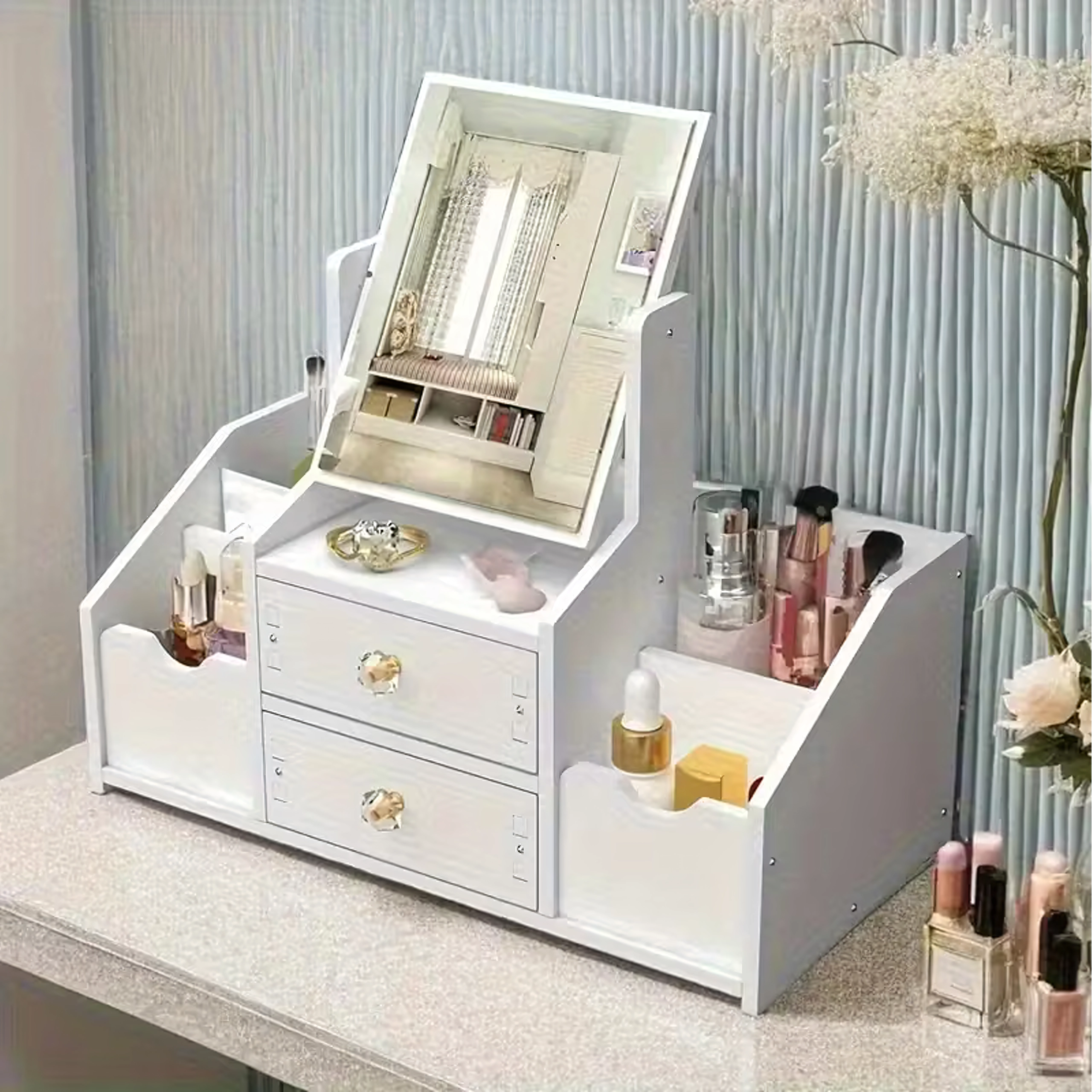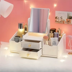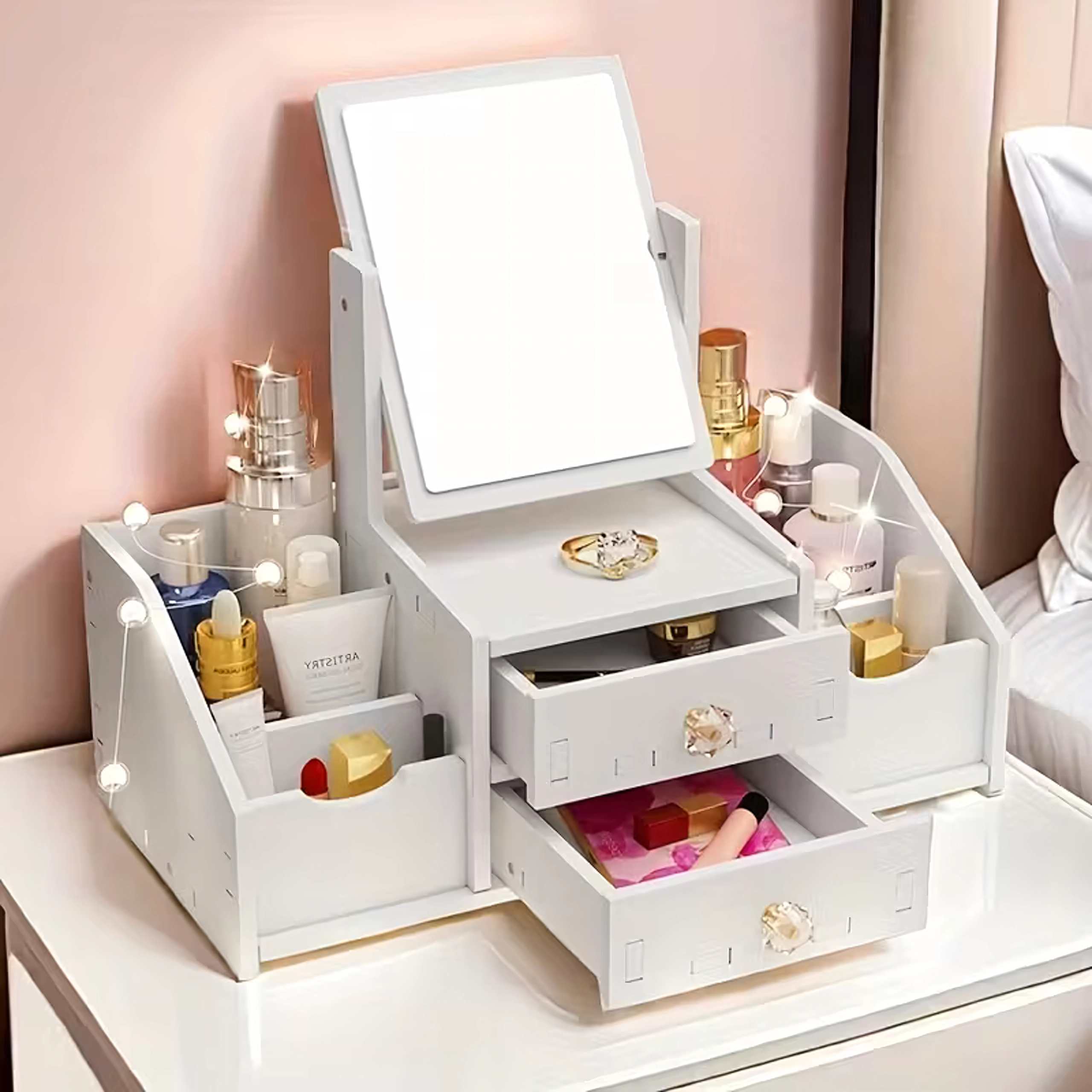 Składane lustro zapewnia odpowiedni kąt podczas makijażu i pielęgnacji, dzięki czemu wszystko wykonasz wygodnie w jednym miejscu.