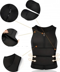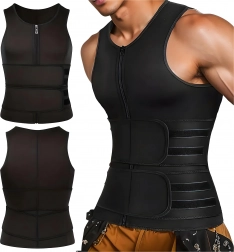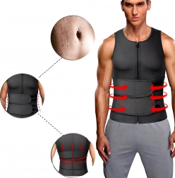 Ta męska kompresyjna kamizelka sauna z wysokiej jakości neoprenu podnosi temperaturę ciała podczas treningu, wspierając szybsze pocenie i skuteczne modelowanie talii. Zamek na całej długości ułatwia zakładanie, a dwa szerokie regulowane paski na rzep umożliwiają precyzyjne dopasowanie stopnia ściągnięcia w okolicy brzucha i środka ciała.
