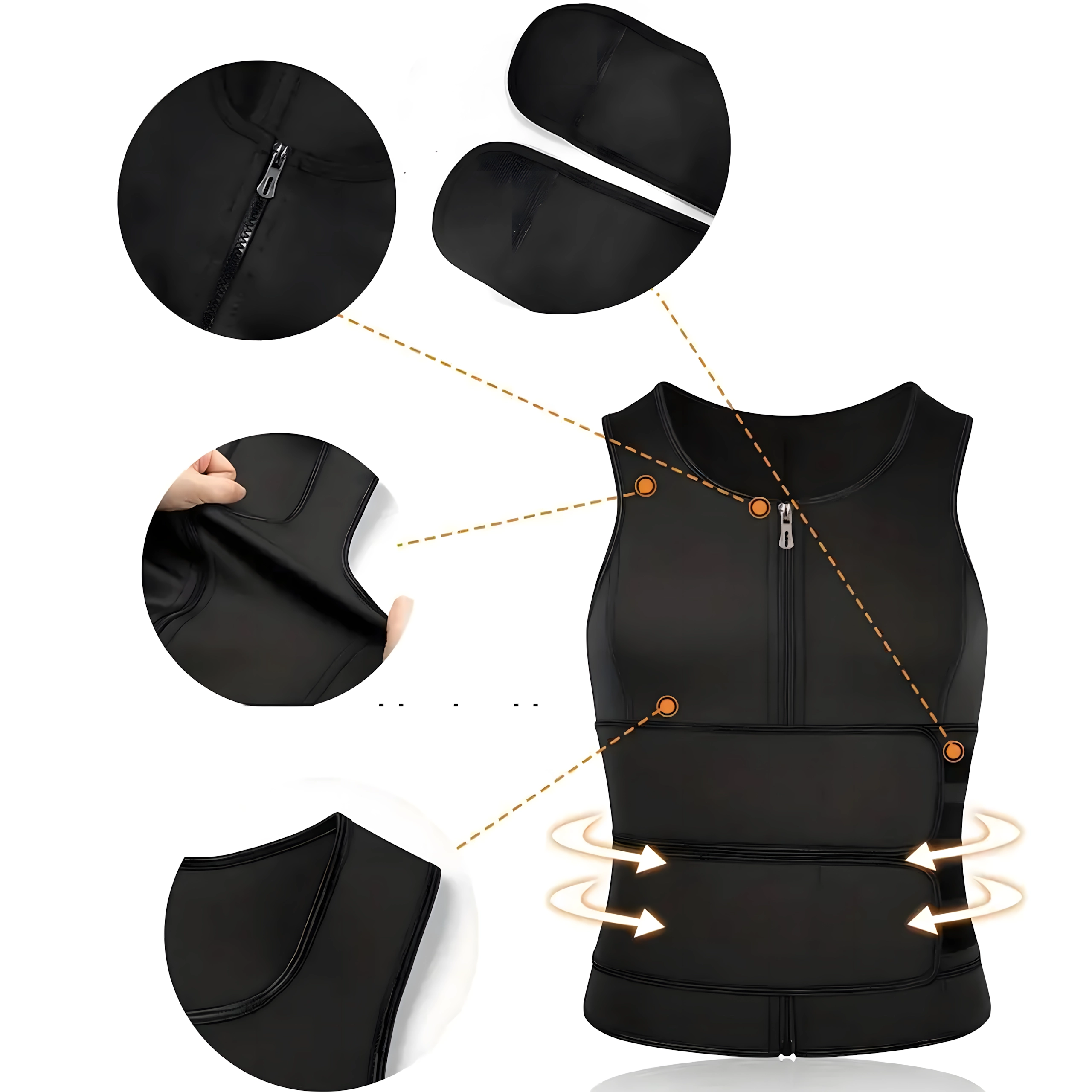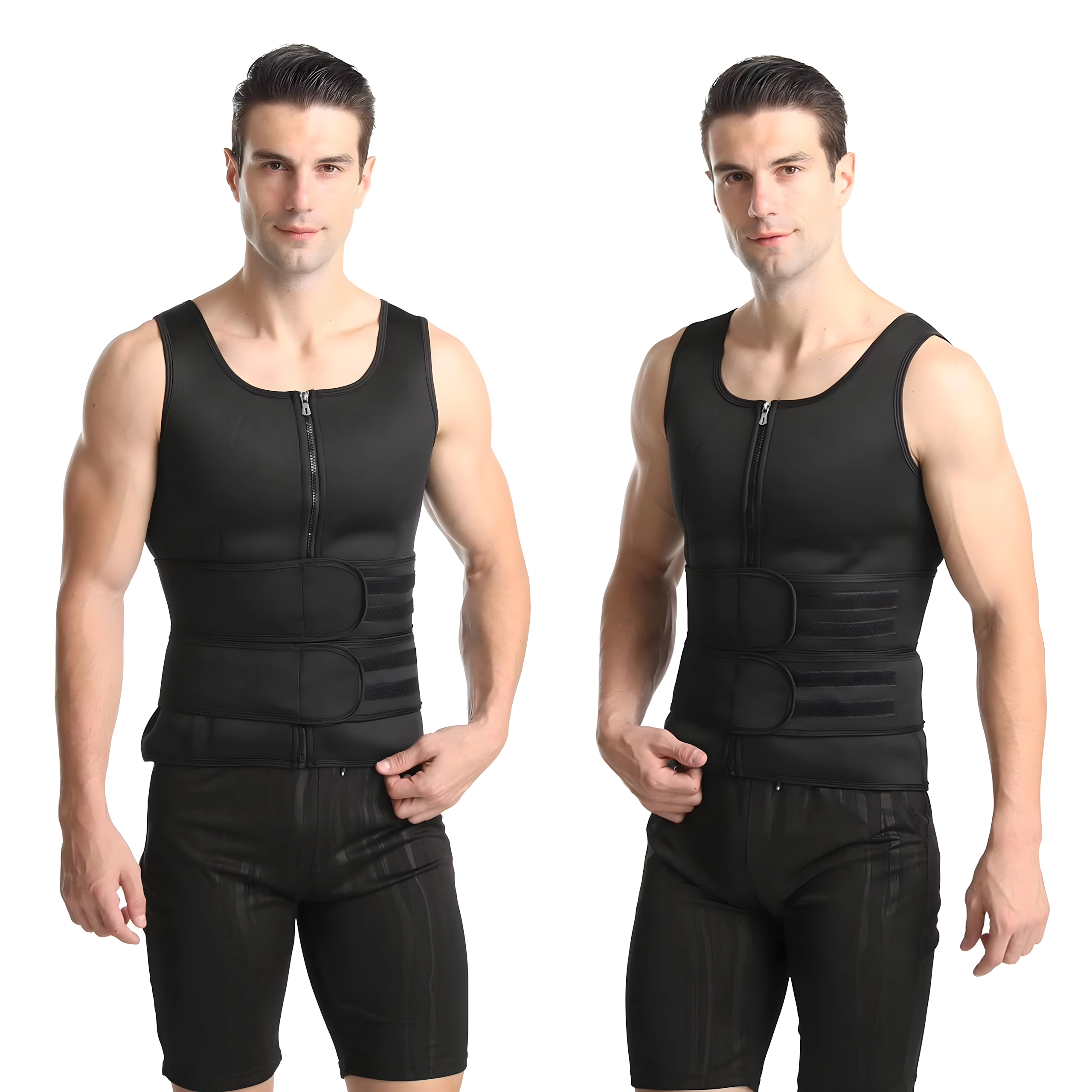 Ta męska kompresyjna kamizelka sauna łączy elastyczny materiał z praktycznym przednim zamkiem i podwójnymi pasami ściągającymi na rzep. Zwiększając efekt termiczny, wspiera intensywniejsze pocenie i może pomagać w modelowaniu sylwetki, a solidna konstrukcja zapewnia stabilizację core i pleców.