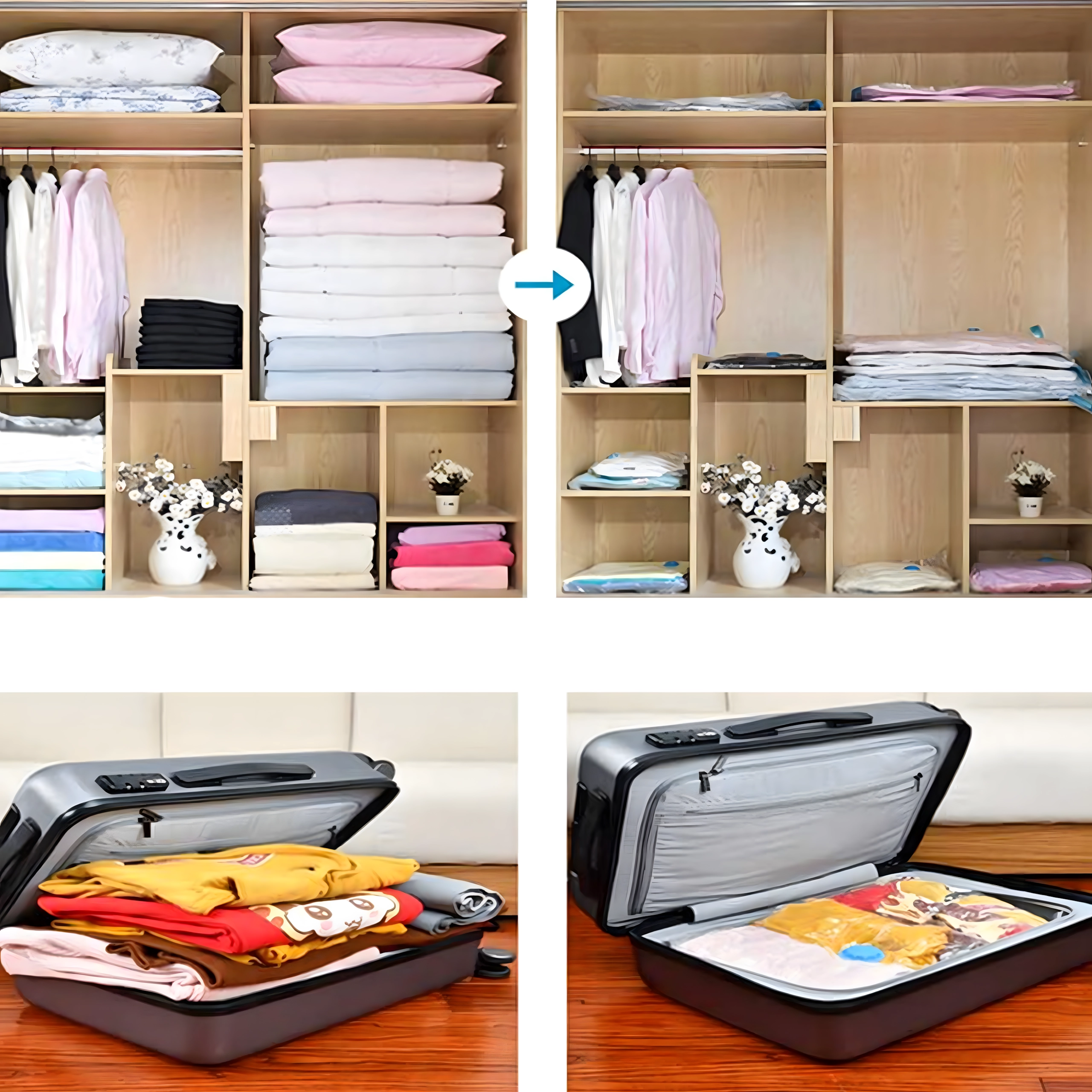 Dzięki kompresji odzieży i pościeli zyskasz więcej przestrzeni w podróży i w domowej szafie. Utrzymuj rzeczy przejrzyście uporządkowane i chronione.