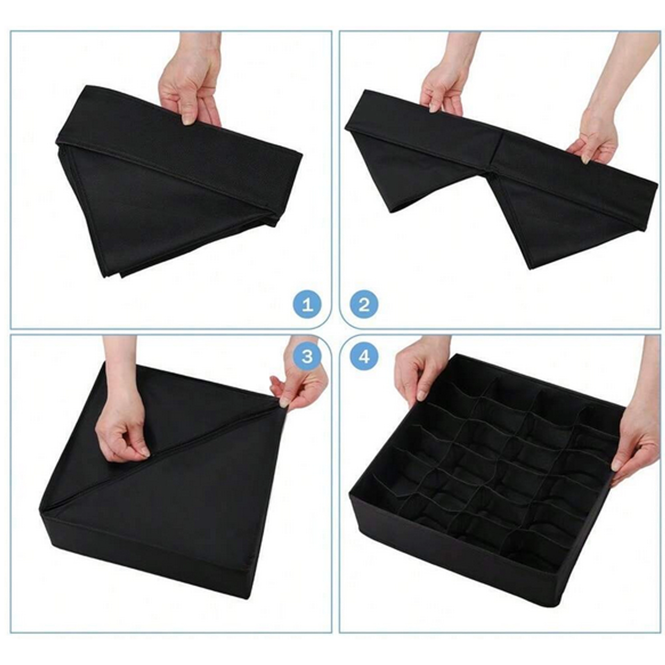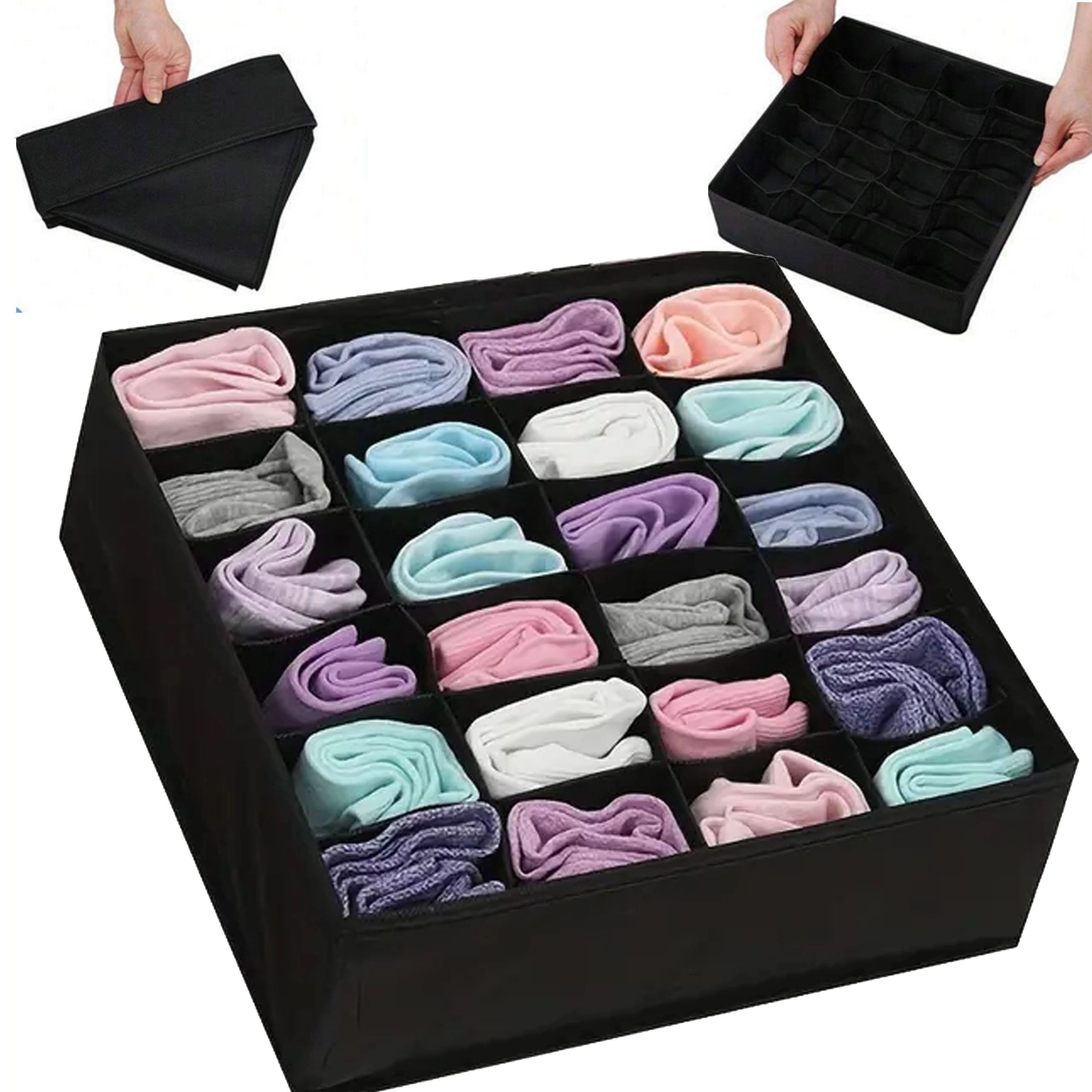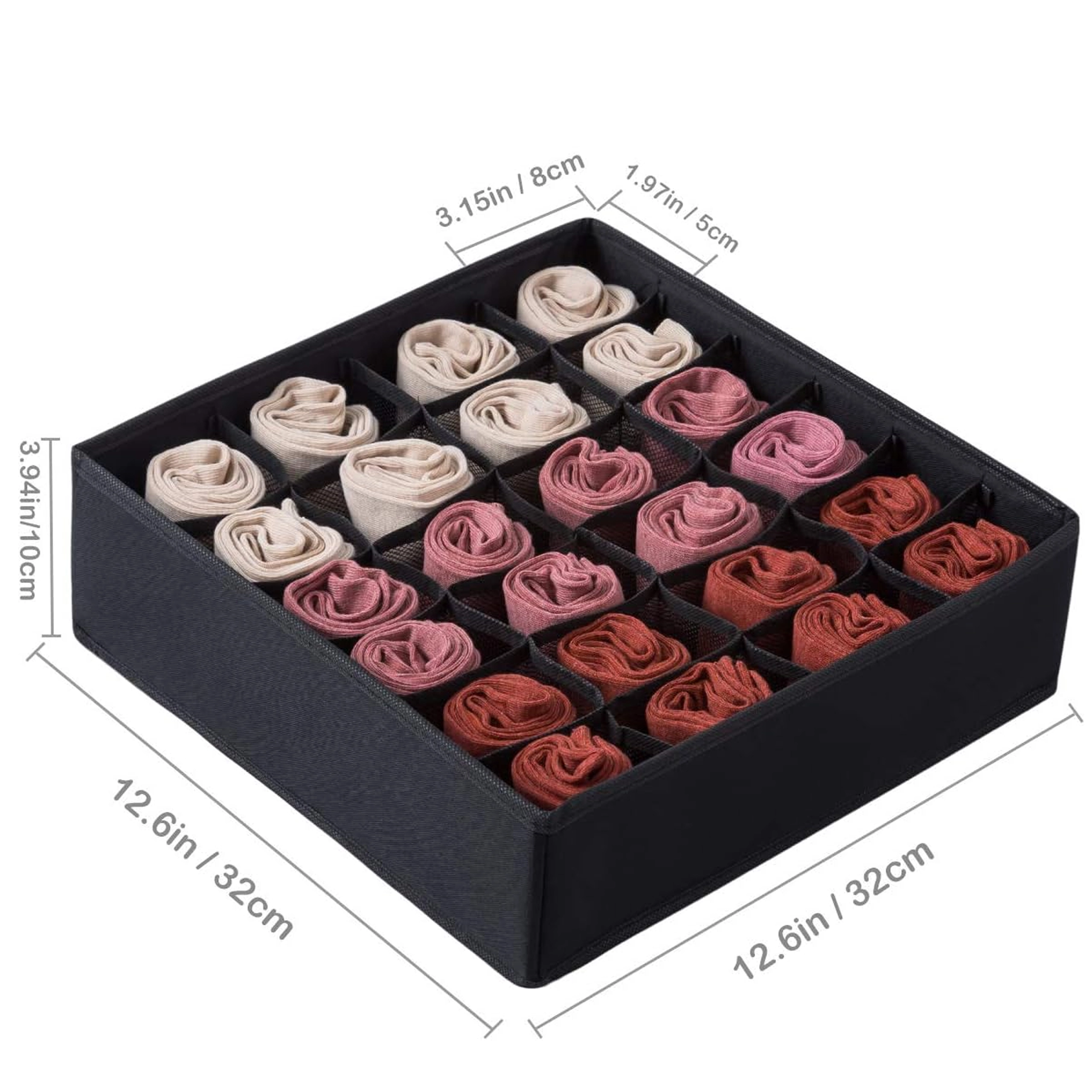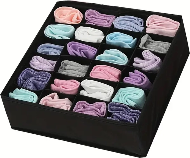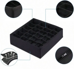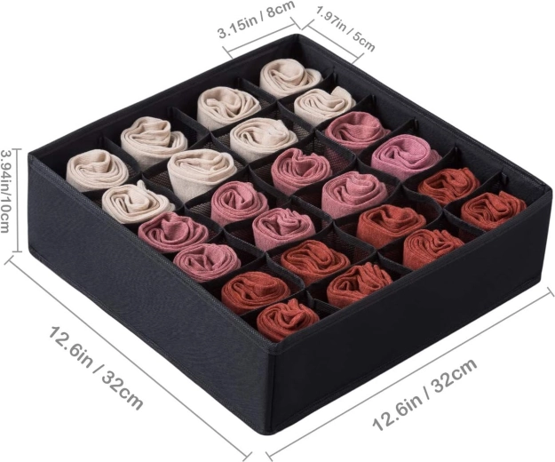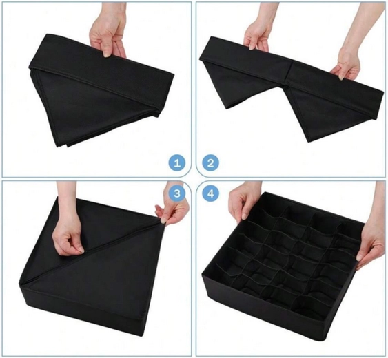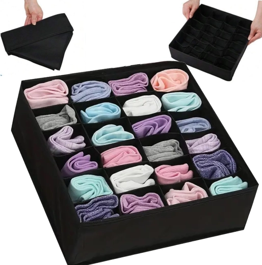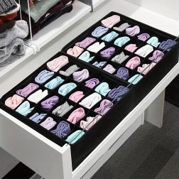 Wymiary 32 × 32 × 10 cm pasują do większości standardowych szuflad i otwartych półek. Organizer to świetny wybór na skarpetki, majtki, biustonosze, rajstopy, krawaty i akcesoria. Montaż jest szybki i prosty – w kilka sekund gotowe.
