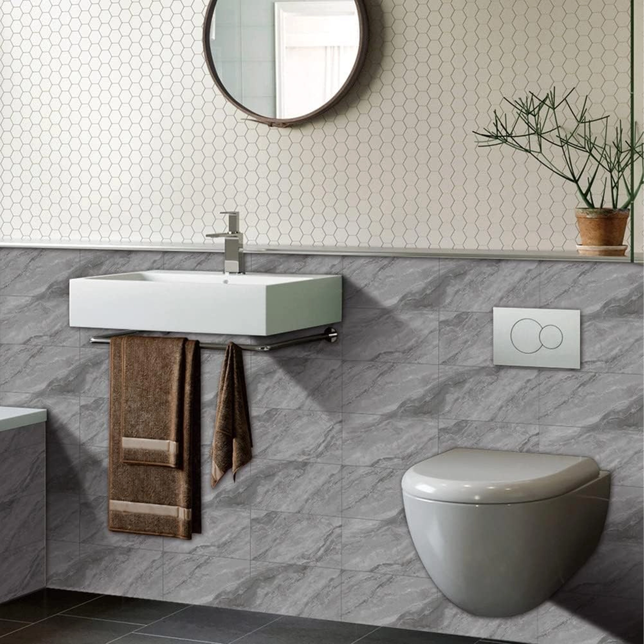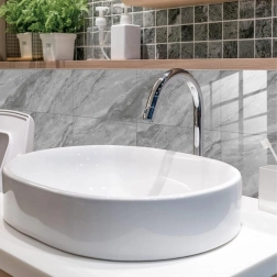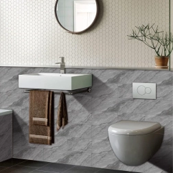 Szare żyłkowanie marmuru nadaje ścianom elegancki i ponadczasowy charakter bez kosztownych prac glazurniczych.