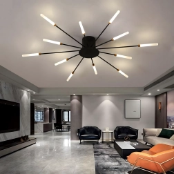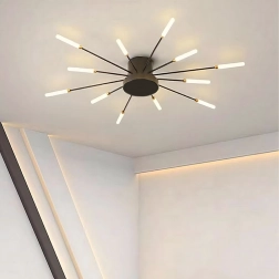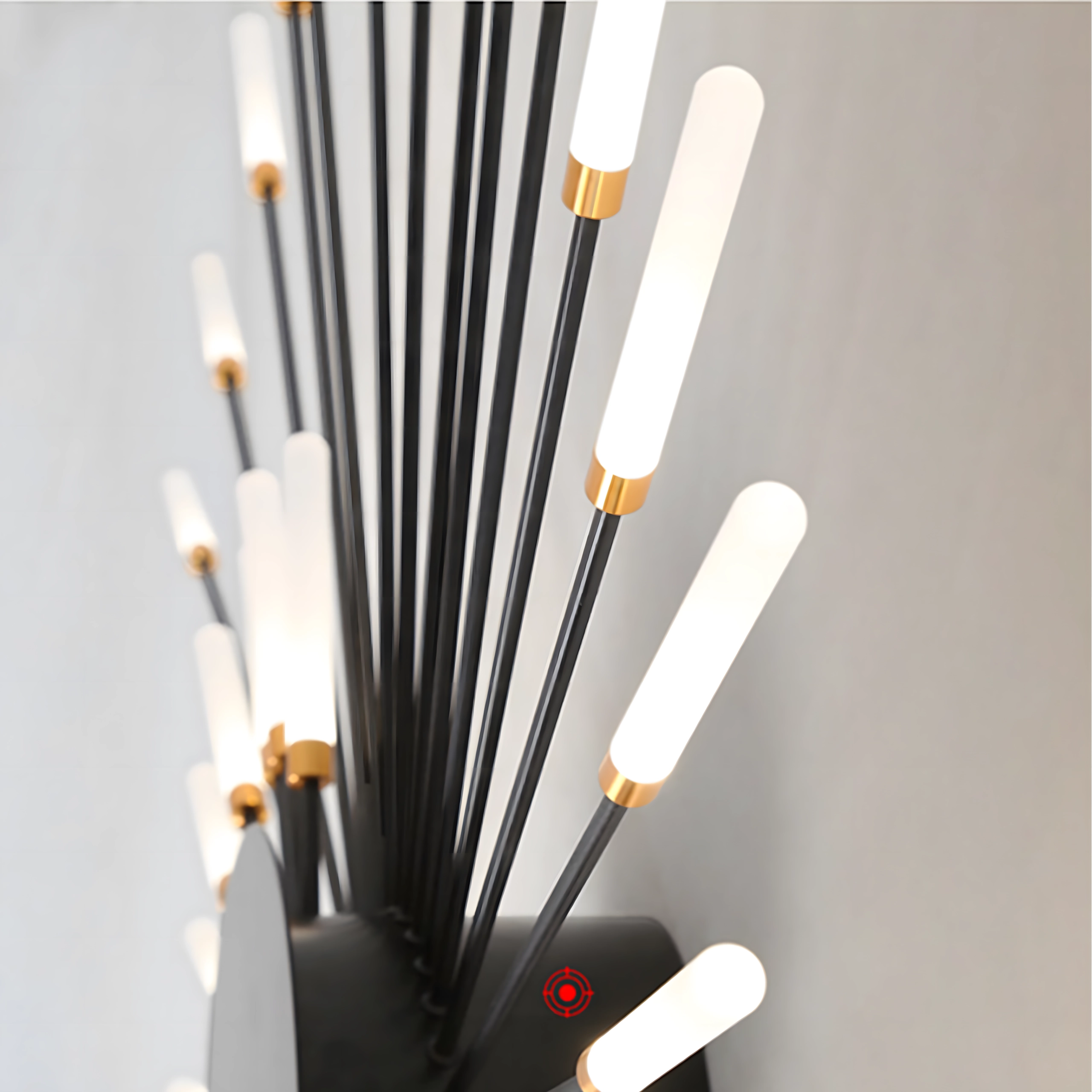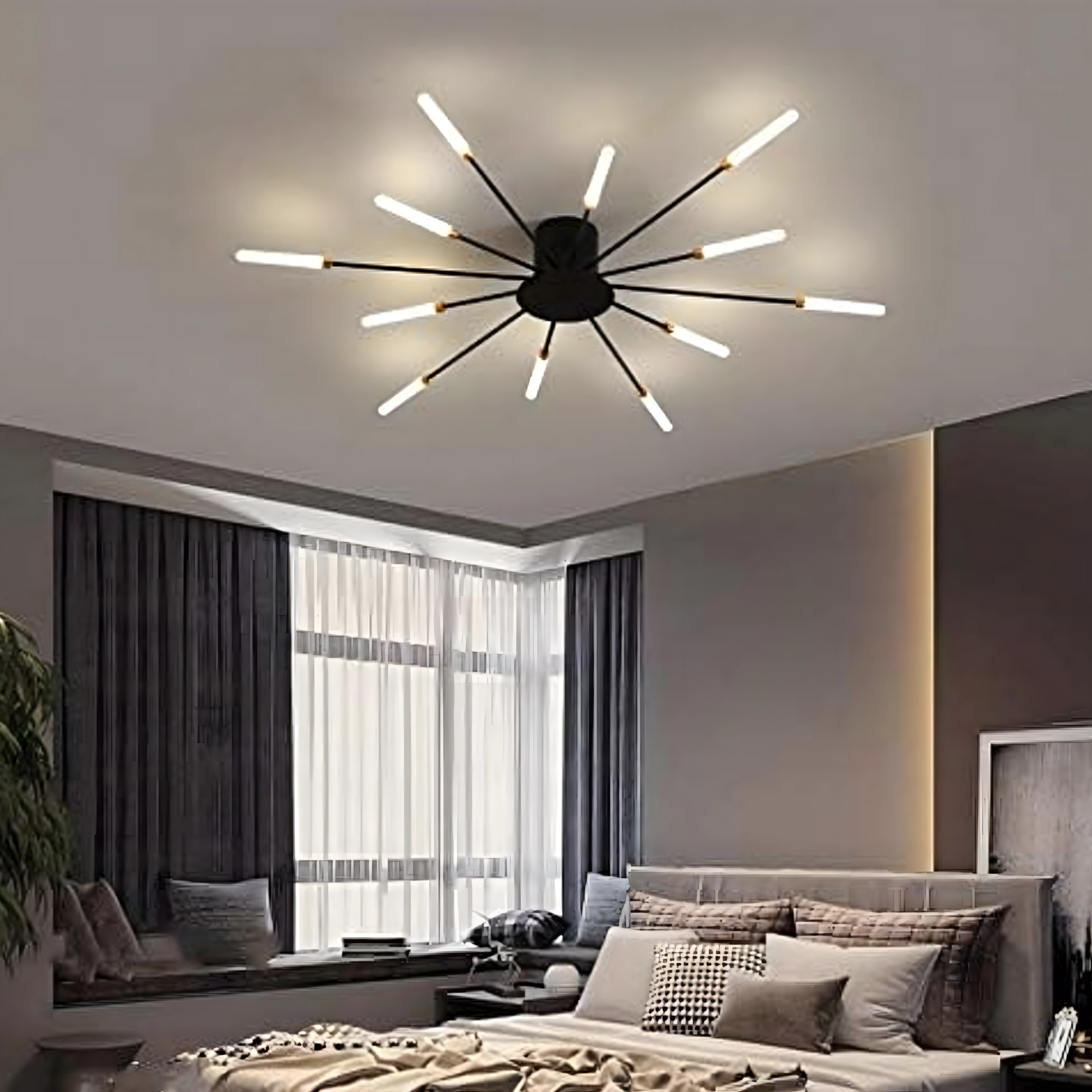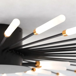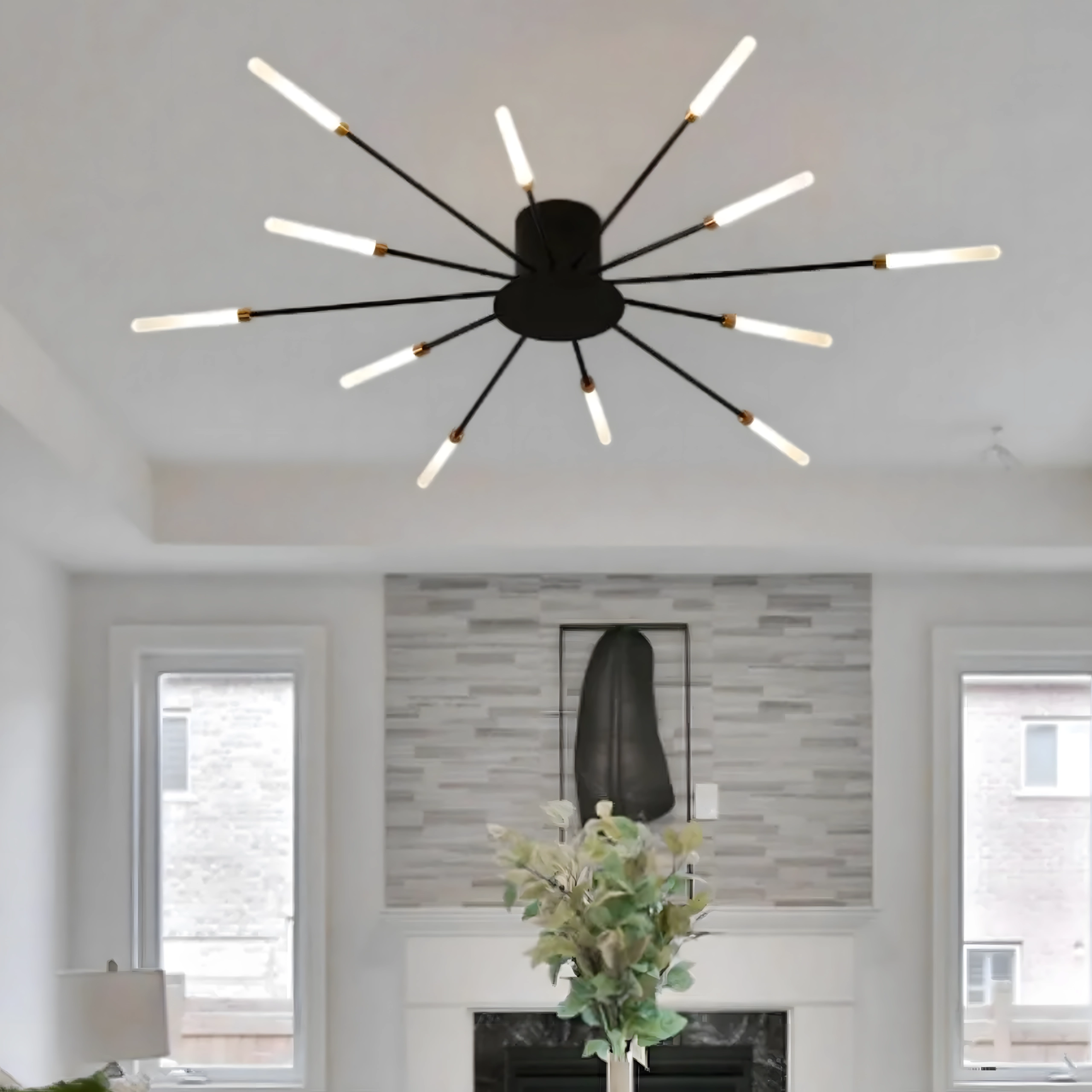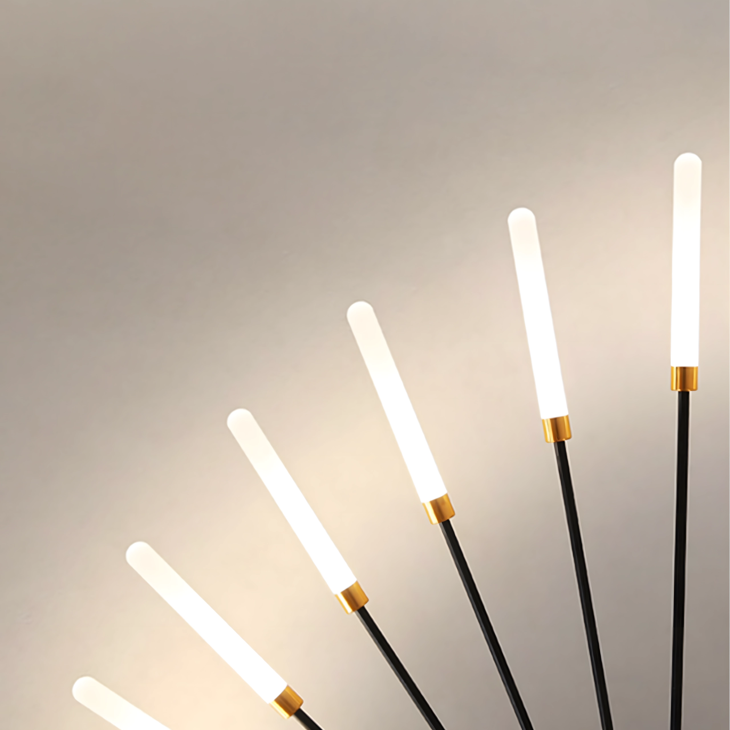 Stylowa lampa sufitowa z wieloramienną konstrukcją tworzy efekt fajerwerków i nadaje Twojemu wnętrzu wyrazisty charakter. Oszczędne LED gwarantują równomierne oświetlenie ogólne bez olśnienia, a matowa czerń i złote detale podkreślają nowoczesną estetykę.