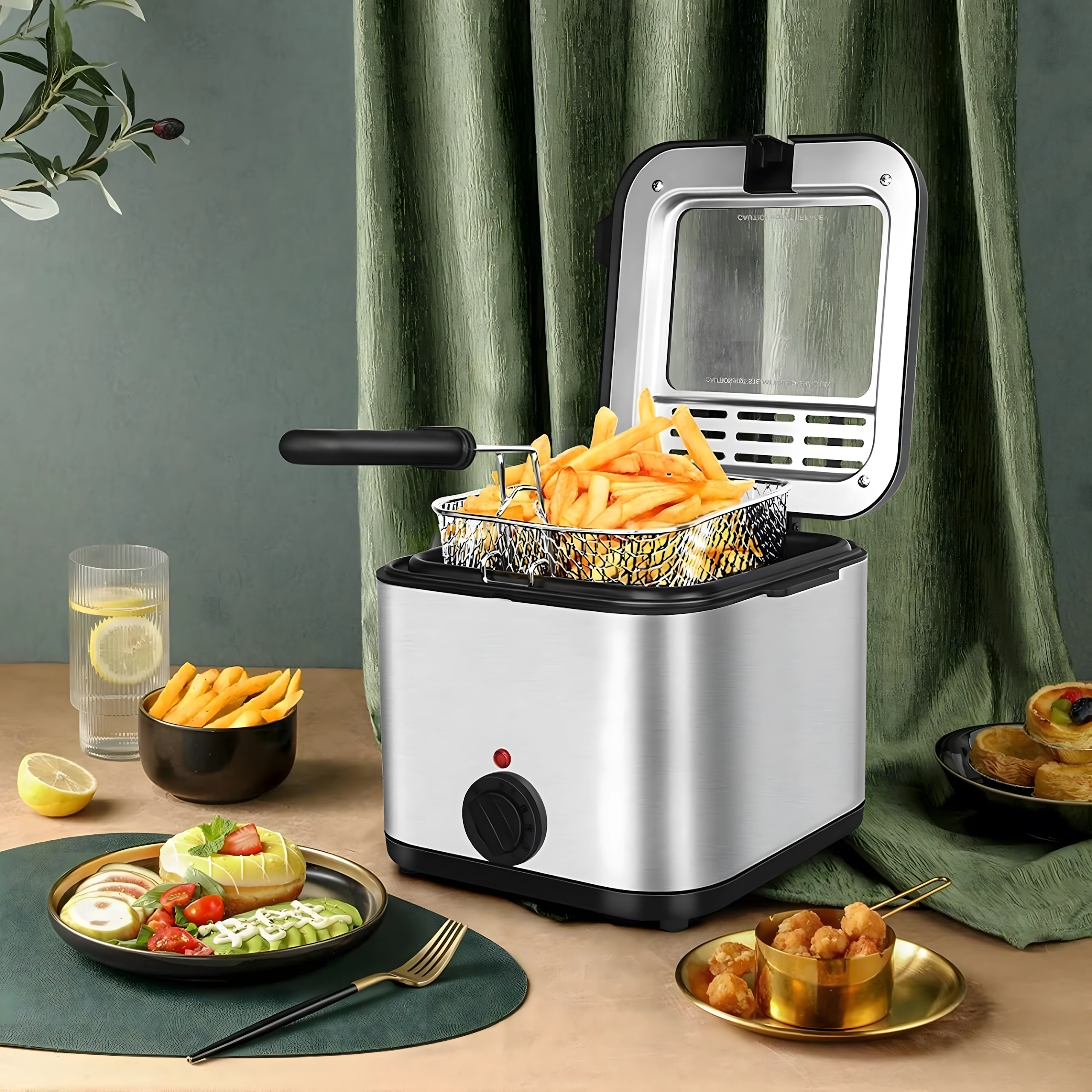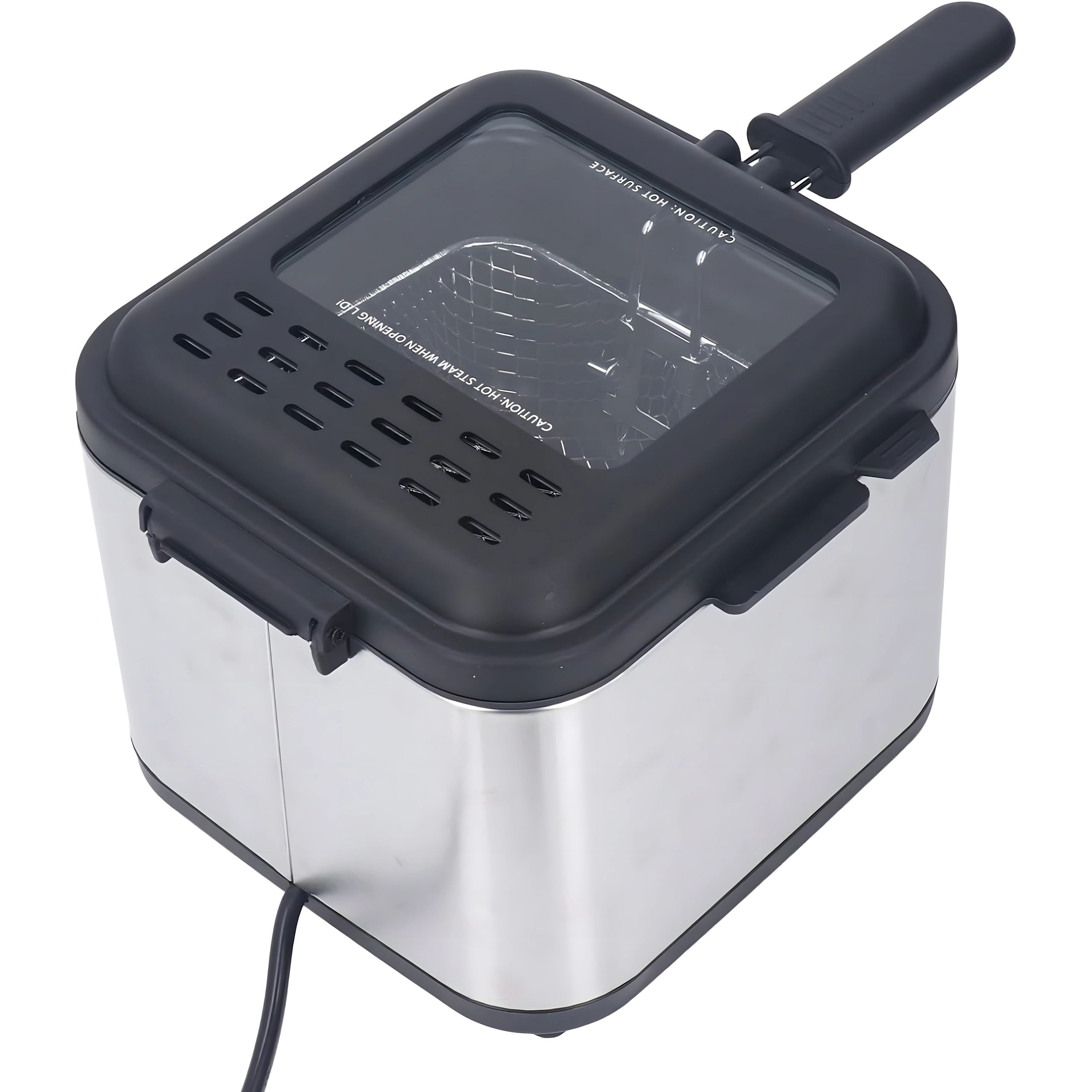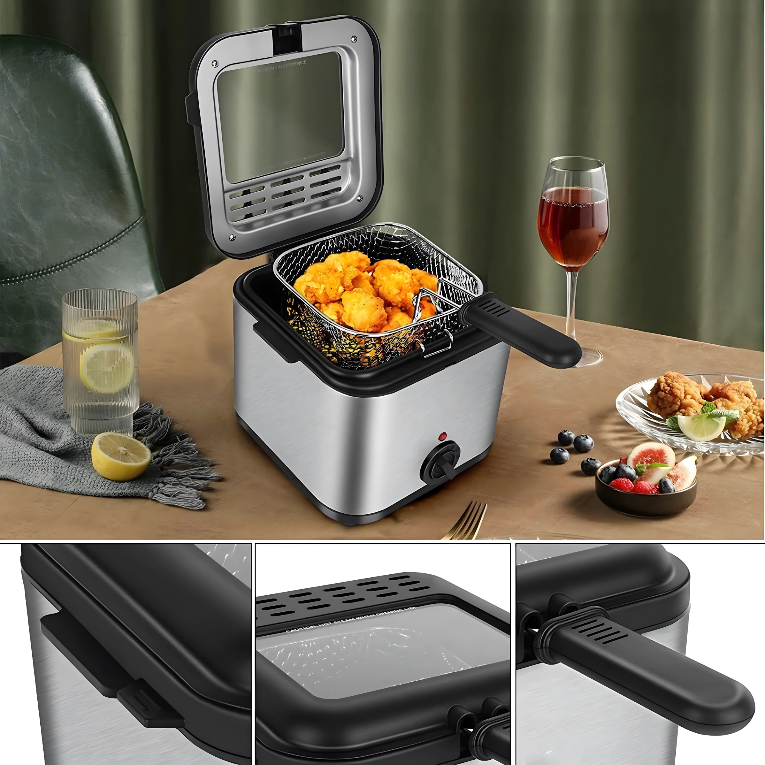 Praktyczne okienko w pokrywie umożliwia podgląd bez zbędnego otwierania, co pomaga utrzymać stabilną temperaturę oleju. Moc 1000 W zapewnia efektywne nagrzewanie i równomierne rezultaty. Wyjmowany kosz z rączką ułatwia obsługę i bezpieczne odcedzanie oleju.