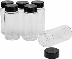 Zestaw zawiera sześć jednakowych pojemników na przyprawy. Przezroczyste ścianki ułatwiają identyfikację zawartości, a pokrywki utrzymują świeżość.