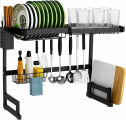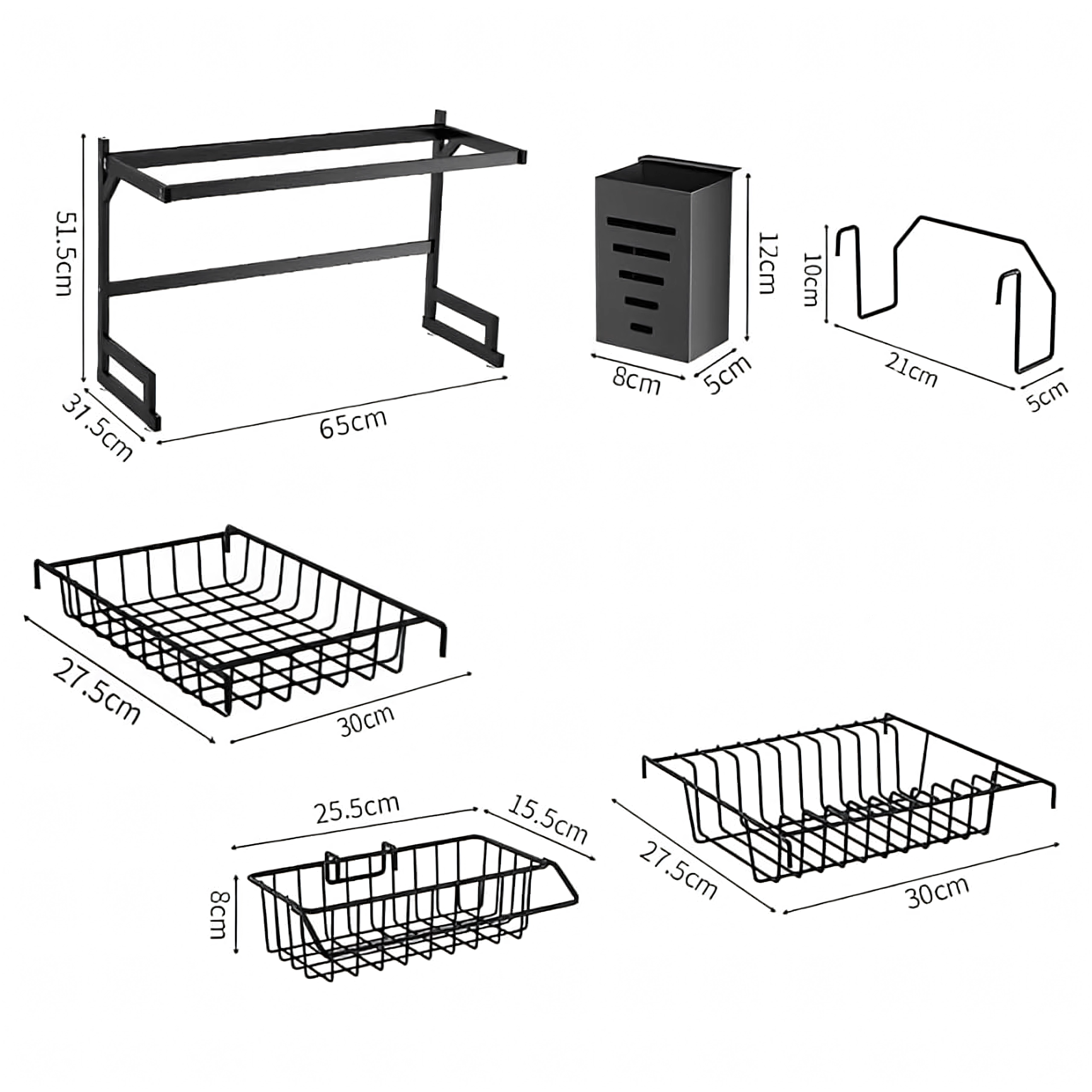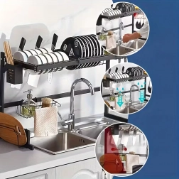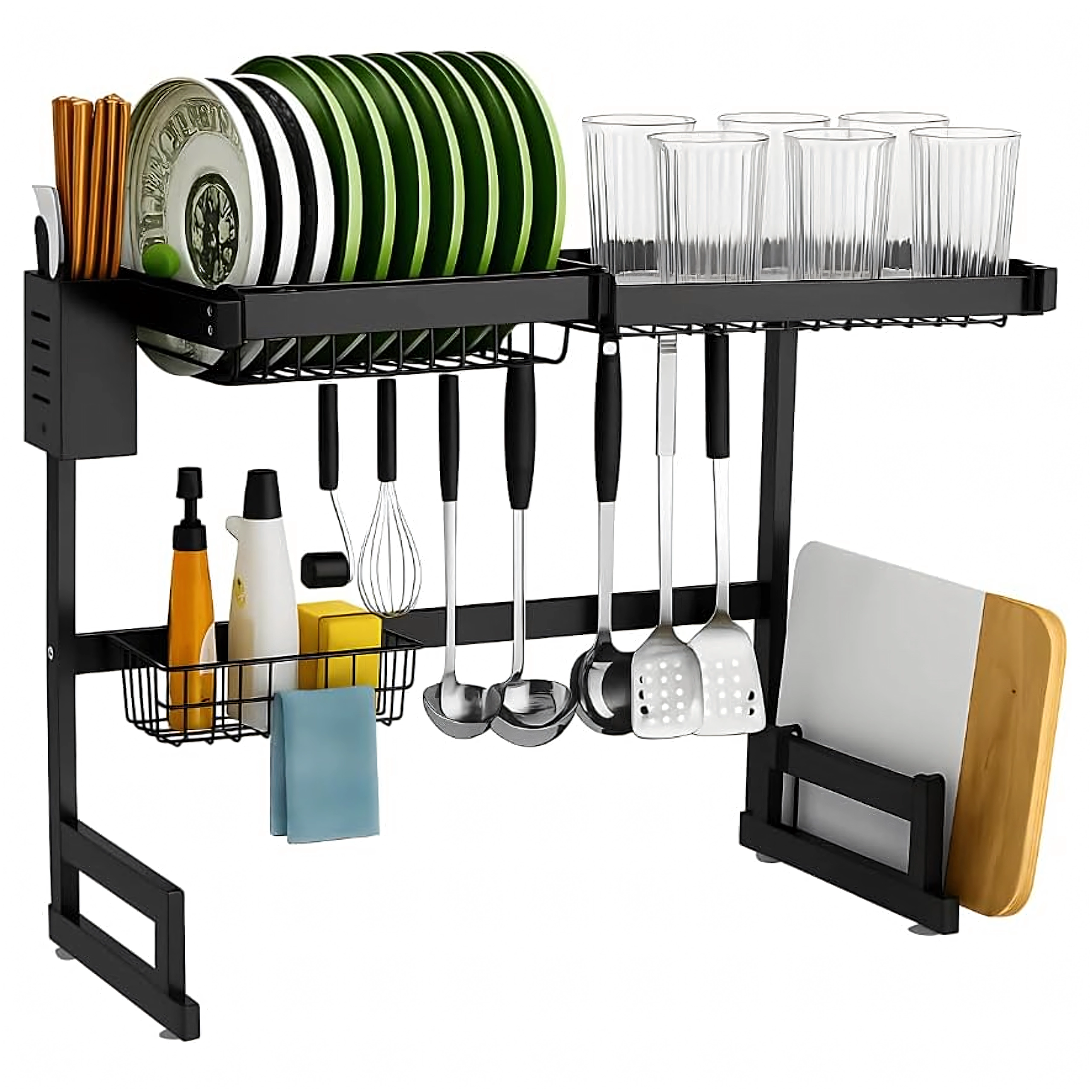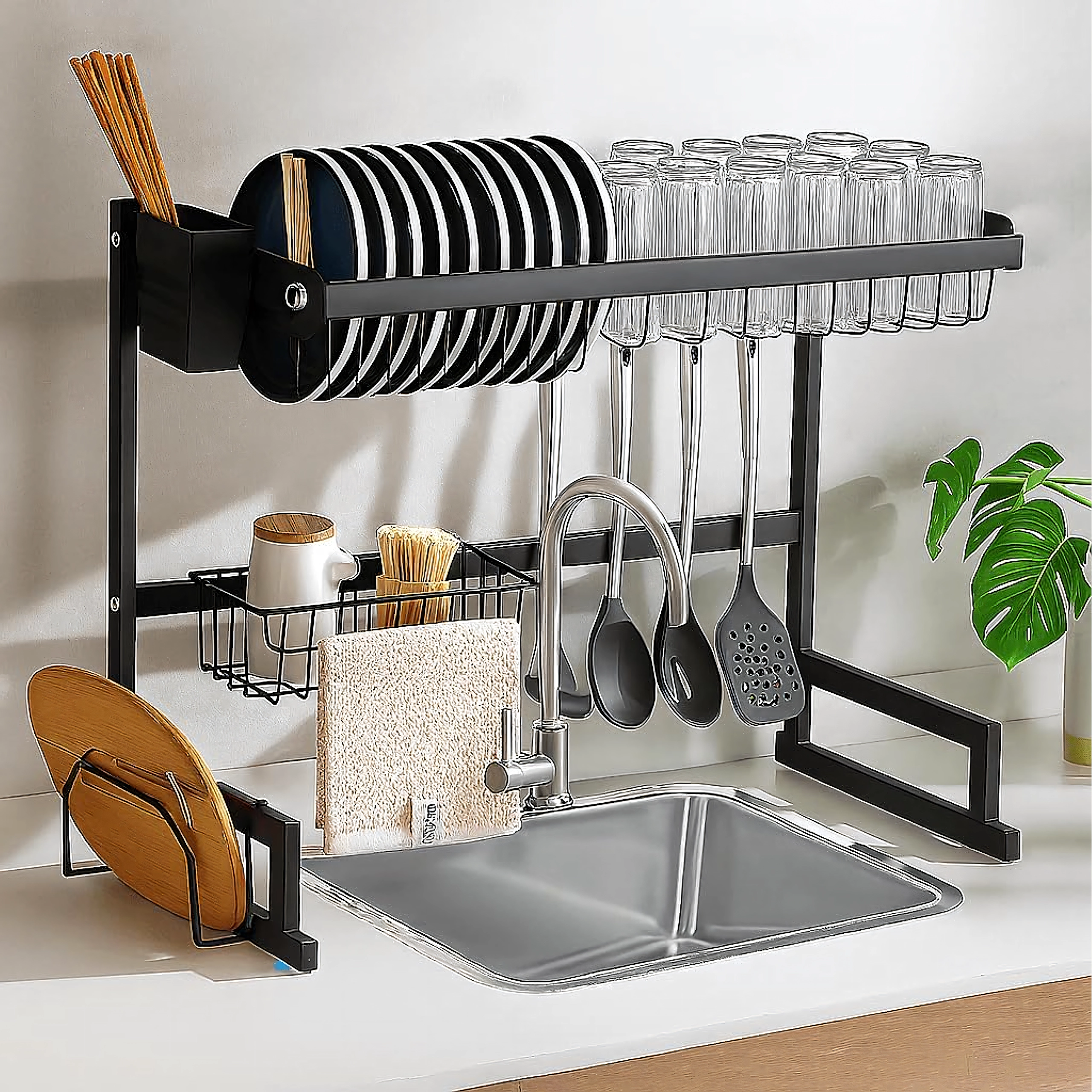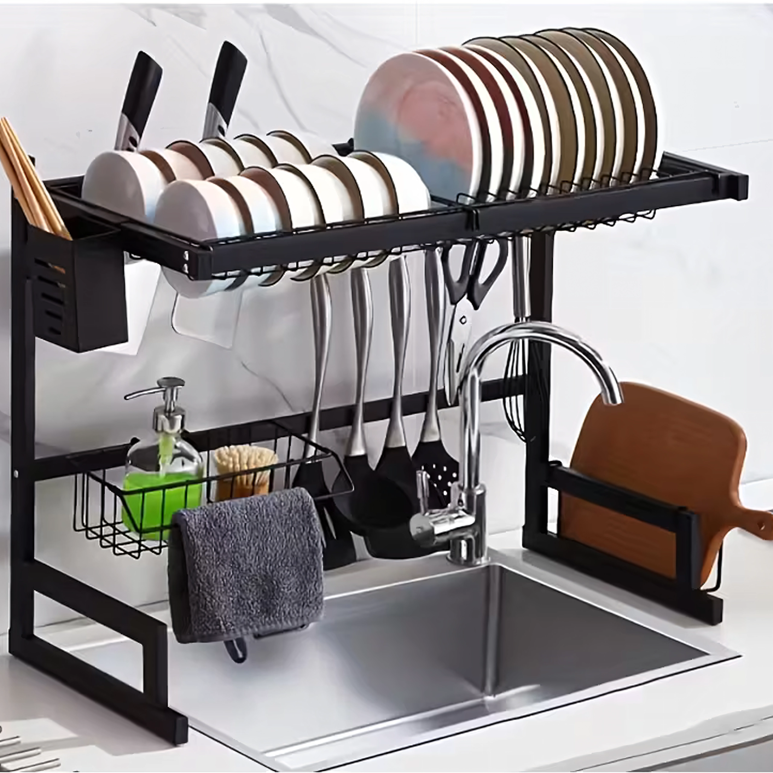 Praktyczna, dwupoziomowa suszarka do naczyń oszczędza miejsce na blacie i utrzymuje kuchnię w porządku. Dzięki solidnej stalowej konstrukcji z powłoką proszkową jest stabilna, trwała i łatwa w czyszczeniu. Modułowe uchwyty, uchwyt na deskę do krojenia oraz antypoślizgowe przyssawki zapewniają wygodne i bezpieczne użytkowanie na co dzień.