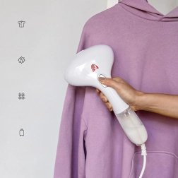 Oszczędzaj czas i miejsce dzięki praktycznemu ręcznemu steamerowi, który z łatwością poradzi sobie z codzienną pielęgnacją ubrań. Silny strumień pary skutecznie redukuje zagniecenia, odświeża włókna i pomaga eliminować zapachy – bez potrzeby użycia deski do prasowania.