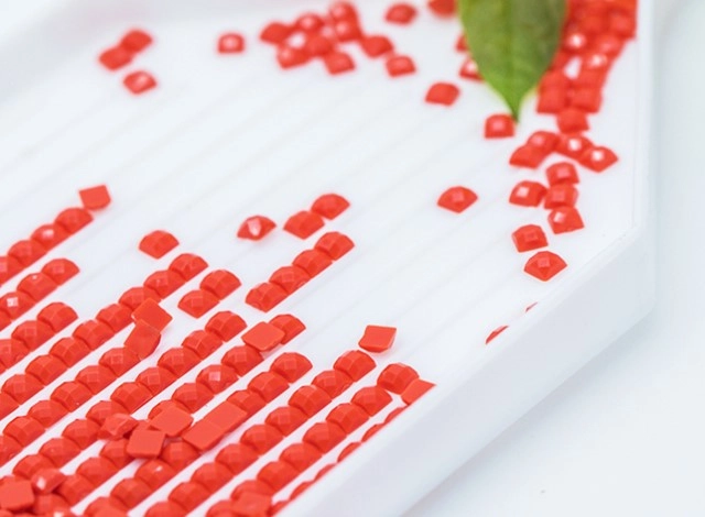 - Klejące, wstępnie nadrukowane płótno, kolorowe kryształki (drille), długopis aplikacyjny, wosk, tacka do sortowania