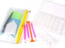 - Wałek, tacki sortujące, aplikatory (długopisy), pęseta, wosk, skrobak, organizer do przechowywania, samoprzylepne etykiety, siatkowe etui na zamek