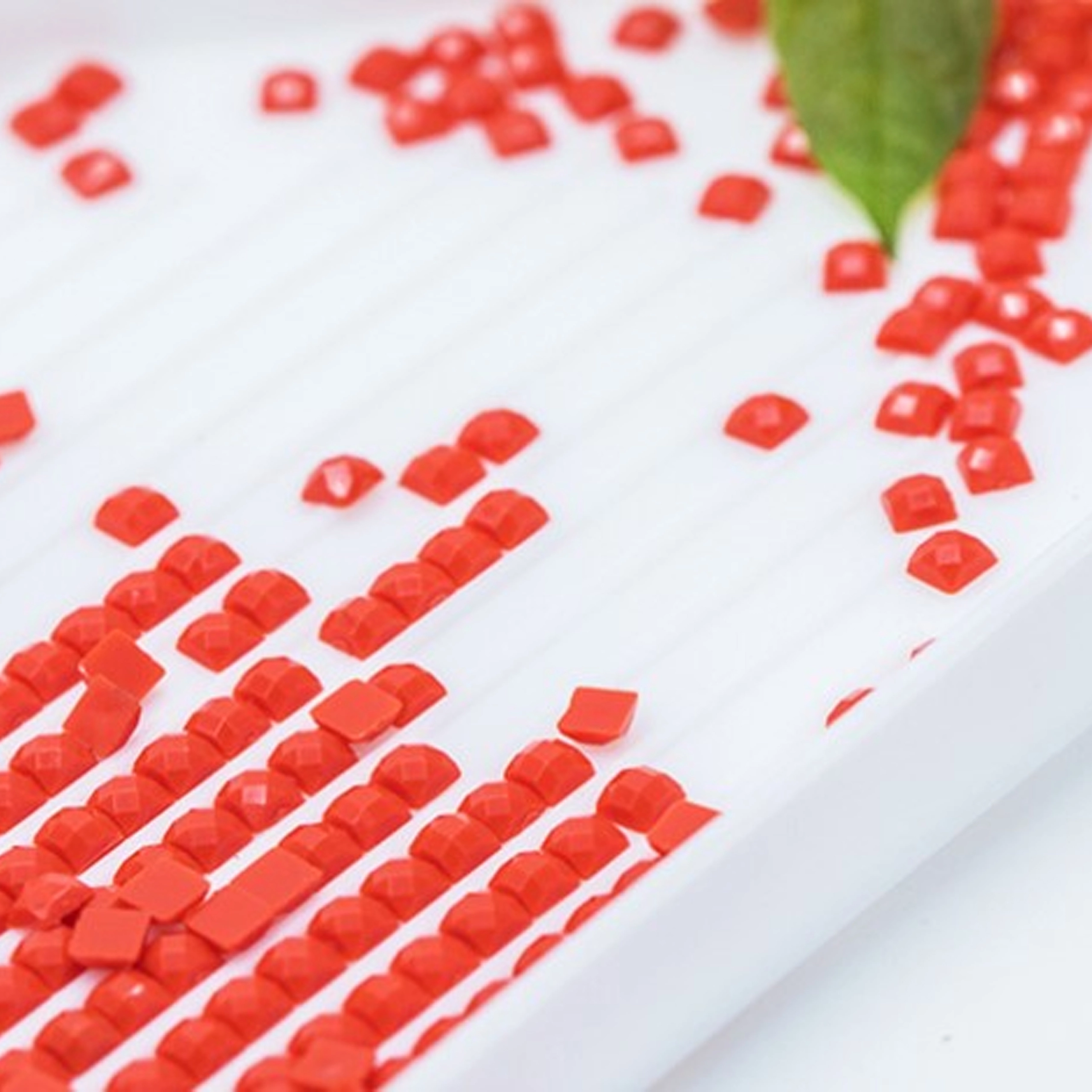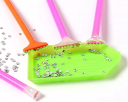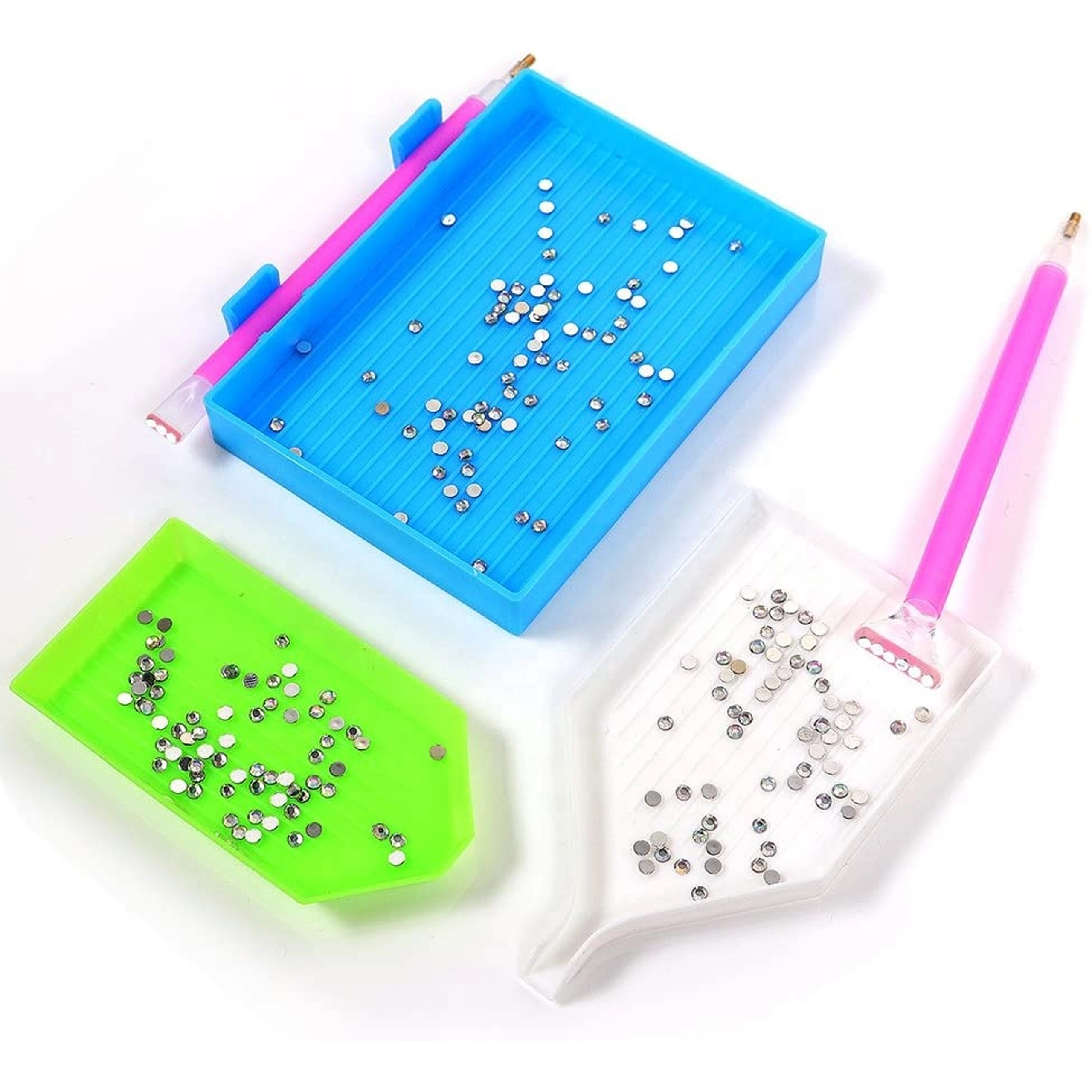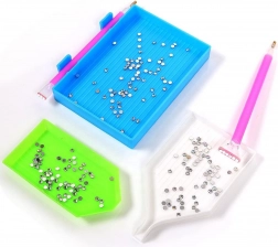 Rowkowane miseczki ustawiają diamenciki w rzędy, a dzióbek ułatwia przelanie z powrotem do woreczków lub organizera bez strat.
