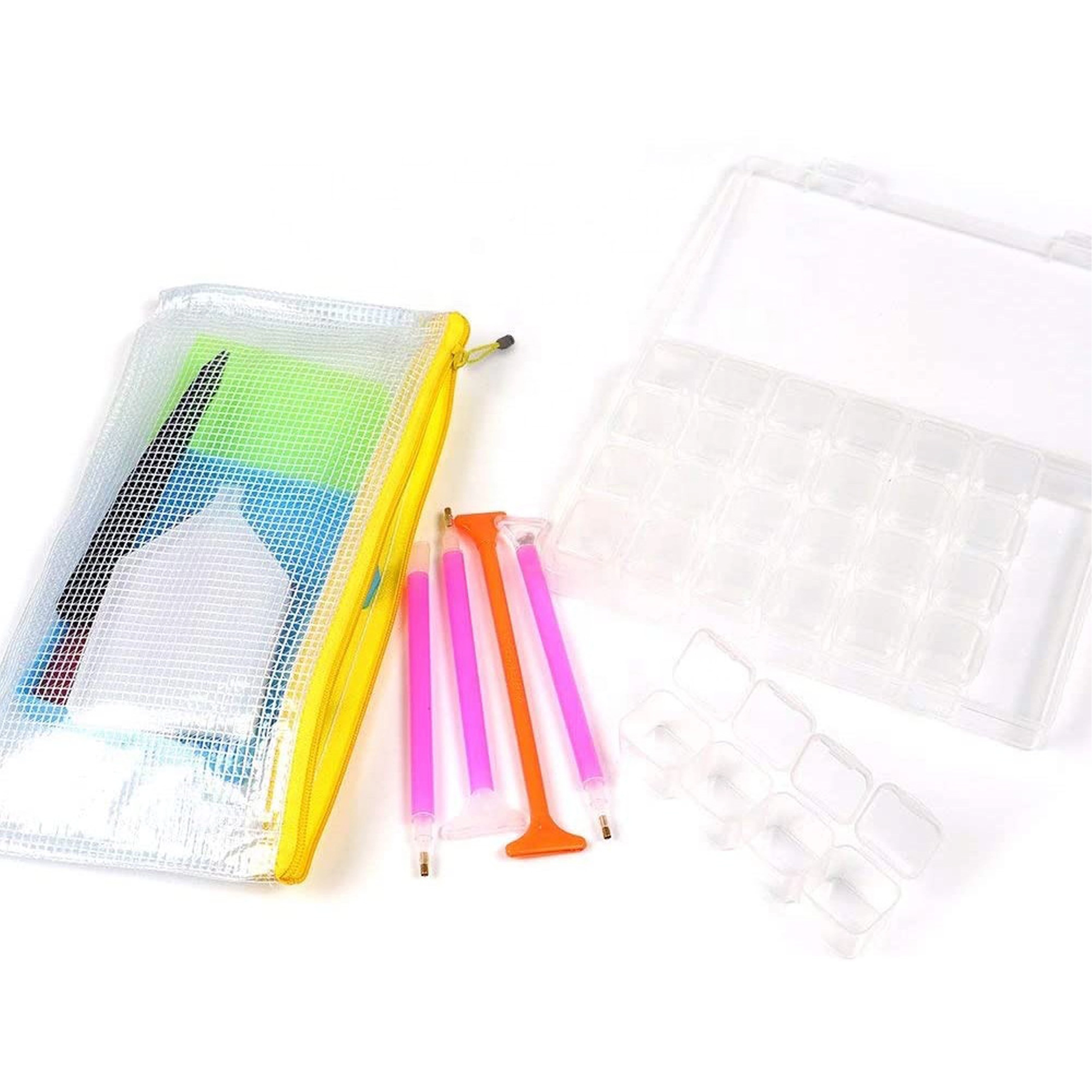 Kompletny zestaw do diamond paintingu ułatwi tworzenie lśniących mozaik. Zawiera wałek do równomiernego dociskania kamyczków, tacki do sortowania, aplikatory, pęsetę, wosk oraz praktyczne organizery, aby wszystkie koraliki były pod ręką i w porządku.