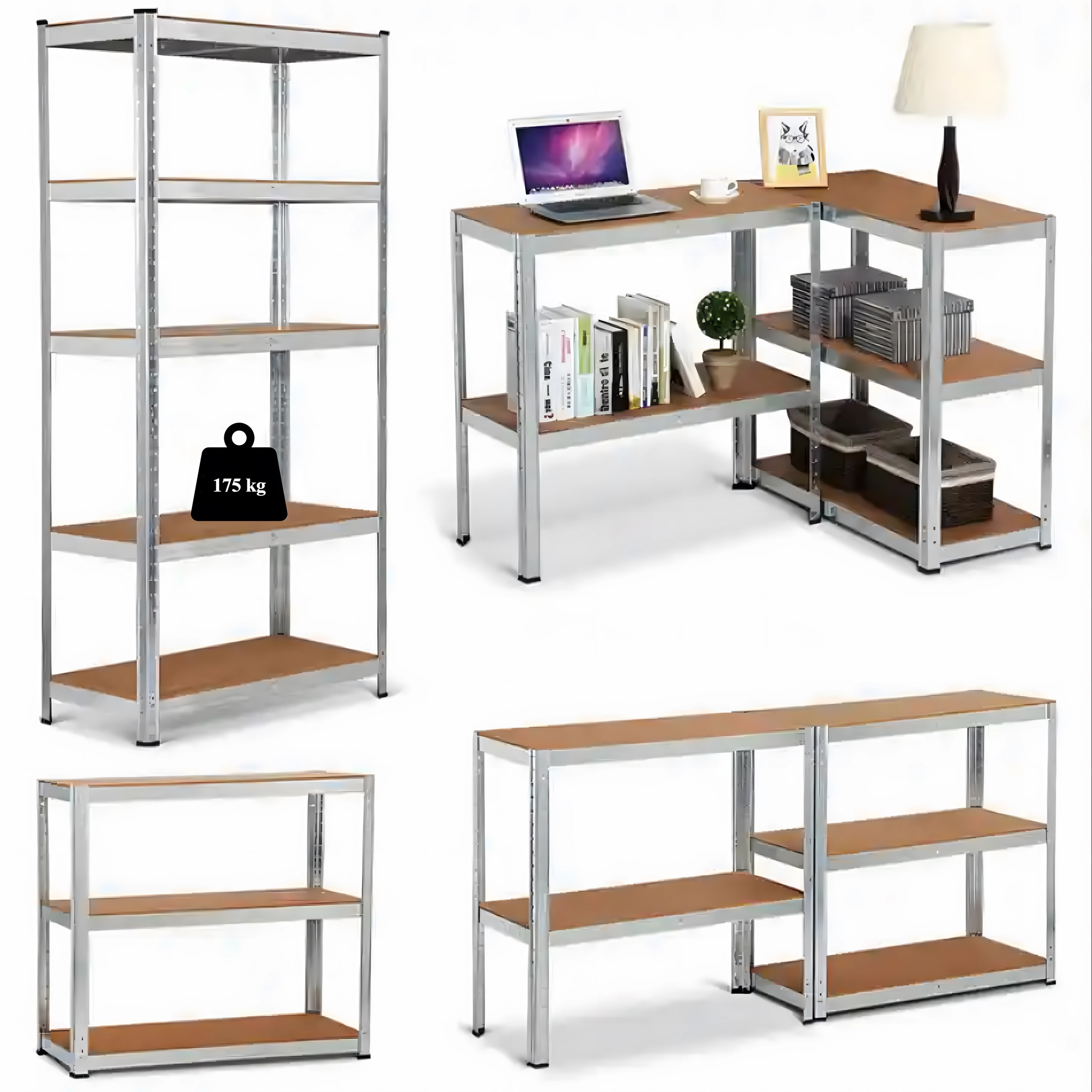 Bezśrubowy system umożliwia szybki montaż i wysoką stabilność. Każda półka ma nośność 175 kg (łącznie do 875 kg), więc poradzi sobie także z cięższymi przedmiotami. Regał można rozłączyć na dwa osobne, niższe stojaki – idealna elastyczność do warsztatu, archiwum lub magazynu.