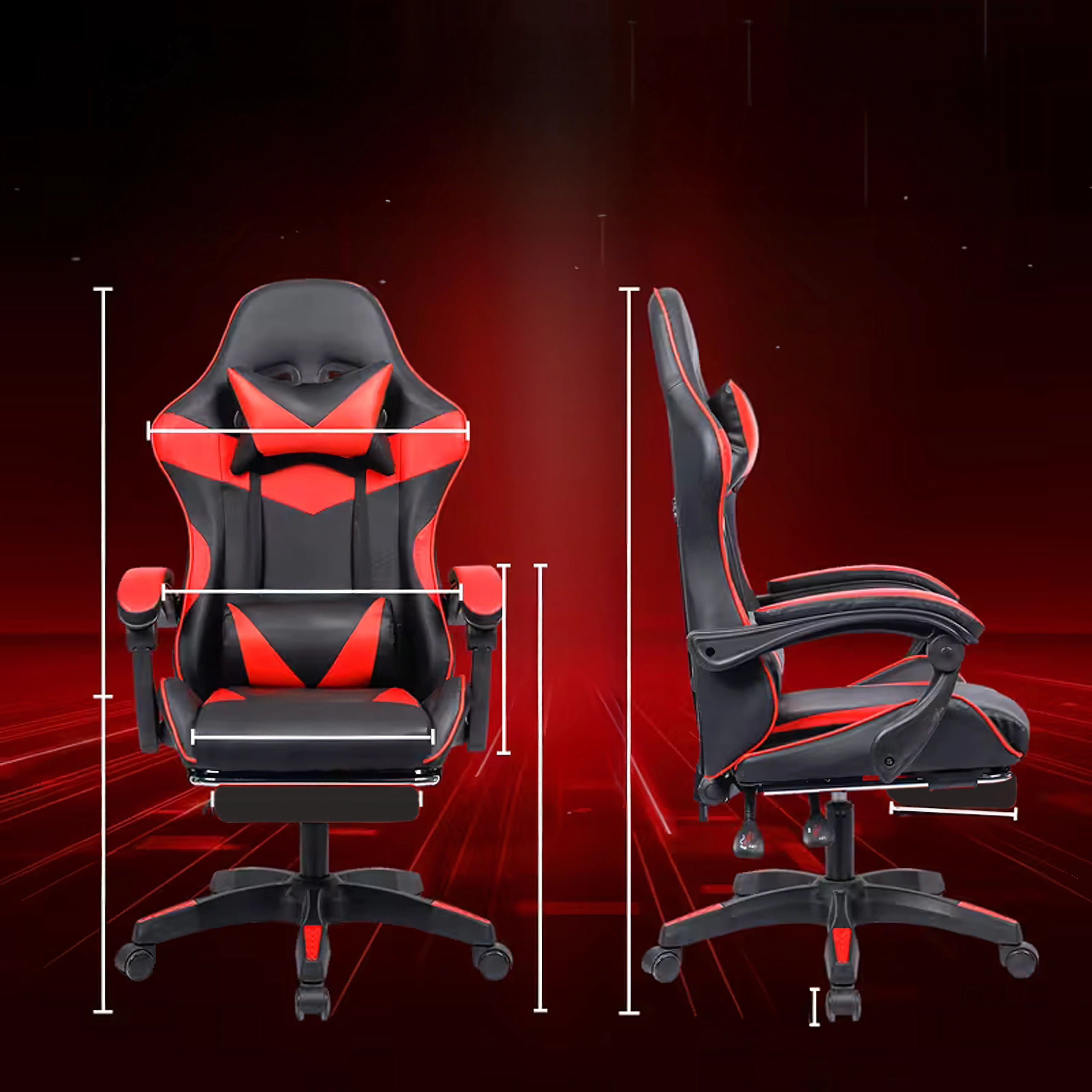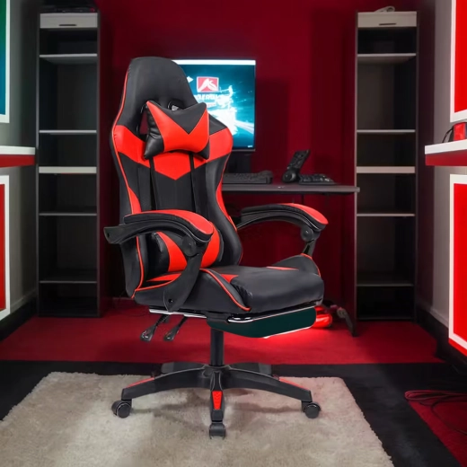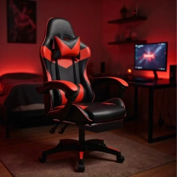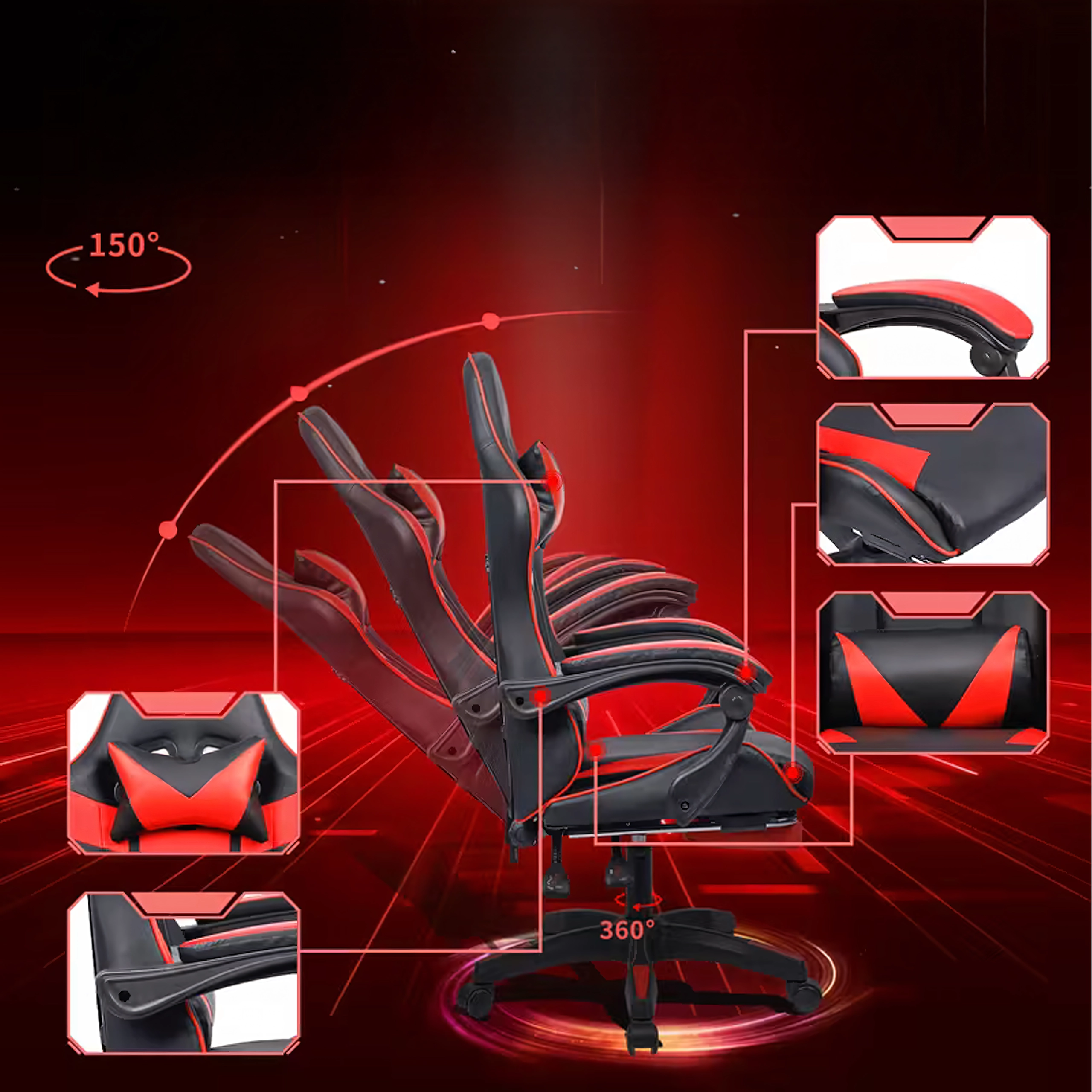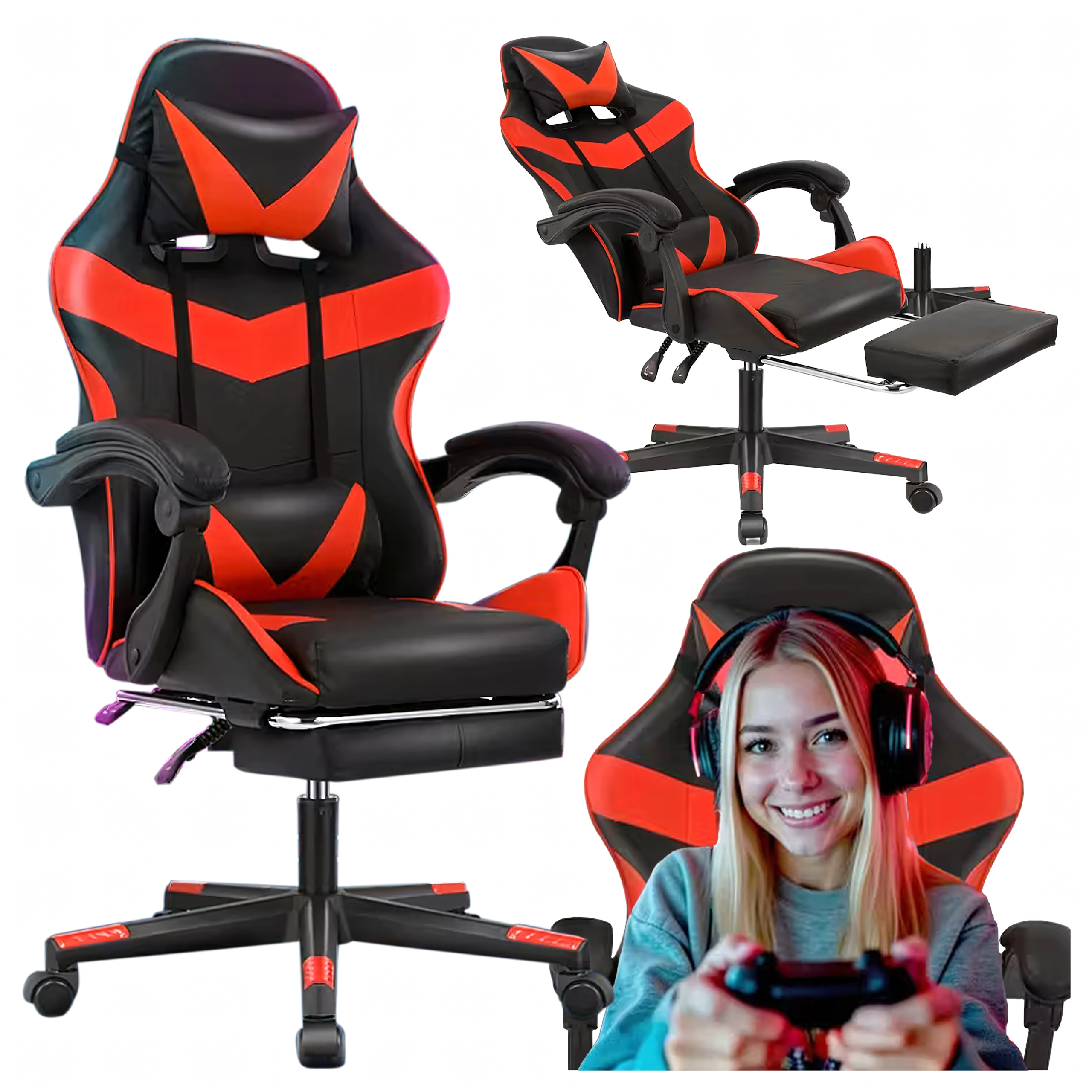 Fotel gamingowy z podnóżkiem został zaprojektowany z myślą o stabilności, wsparciu i wygodnym siedzeniu podczas długich godzin przy komputerze. Wysokie oparcie z zagłówkiem i poduszką lędźwiową pomaga odciążyć plecy, a płynne odchylanie oparcia oraz wysuwany podnóżek pozwalają szybko przejść z trybu pracy do relaksu.